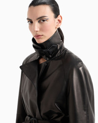 Stylish double-breasted jacket made of supply, luxurious plonge nappa leather in one of the collection’s hallmark colours. The style features wide lapels, a strap closure at the waist, and a storm shield. An exquisite offering that reinterprets a menswear piece with a sophisticated, feminine twist, perfect for completing daytime looks with a bold touch. Double-breasted jacket Large lapels Neck strap detail Raglan sleeves Cape detail on the back Adjustable waist belt Adjusters at the cuffs with covered button Removable inner padded gilet Silk lining Length: 53 Made in Italy Product Code: GW001036AF15300UC001
