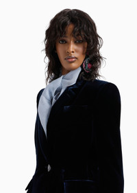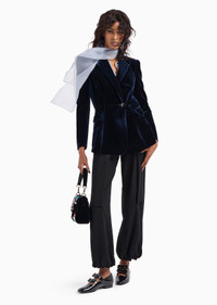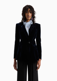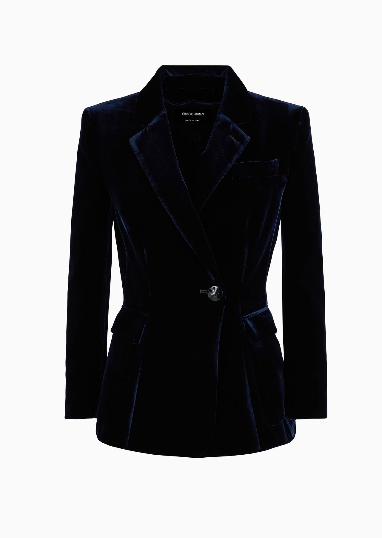Elegant single-breasted jacket made of velvet, in deep, intense shades that distinguish this part of the collection. Featuring notched lapels and flap pockets, it has a slightly asymmetric one-button button placket that highlights the waist. A perfect piece to embellish numerous looks, teamed with silk shirts and blouses. Product Code: GW000152TE108311UB115 Details Composition 80% Viscose 20% Mulberry silk Single-breasted jacket Notched lapels Closure with a one special button Breast pocket Two patch pockets with flap Lined in matching satin Length: 65 cm Made in Italy Fitting The model is 178 cm tall and is wearing size 38/S