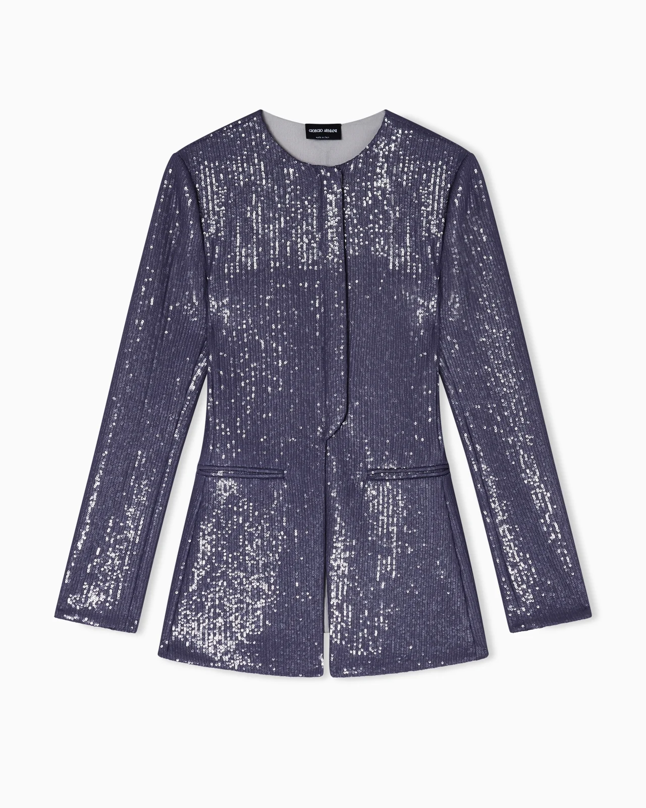 Single-breasted jacket made of jersey, featuring a concealed press-stud fastening. The garment is illuminated by the application of all-over sequins that glimmer with light and add a sophisticated touch. The perfect piece for wearing to the most special occasions. Crew neck Concealed press-stud closure Two small welt pockets Central back vent Embroidered all-over with sequins Length: 65 cm Made in Italy Product Code: GW003210AF24978UA097