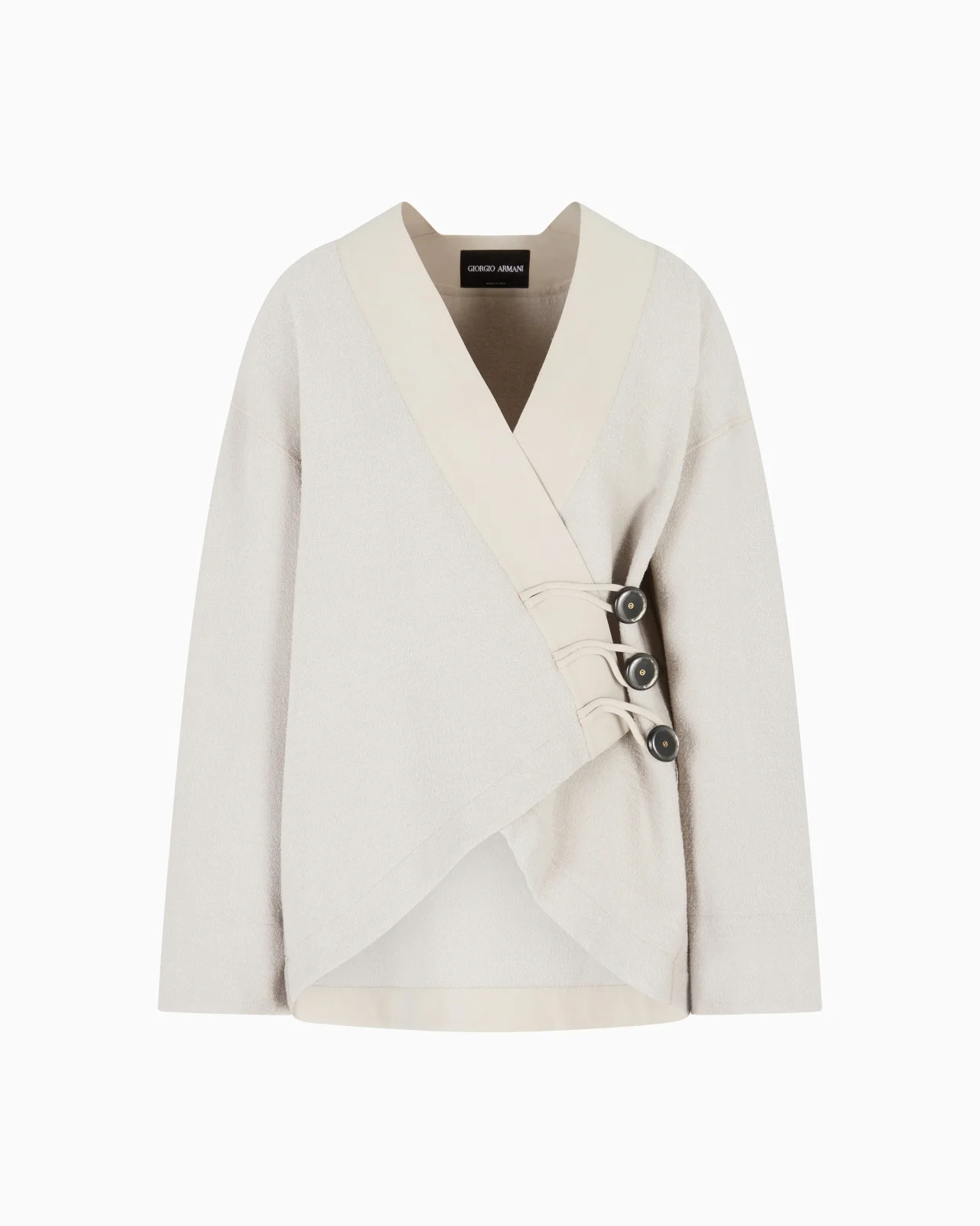 Sophisticated pea coat made of boucle virgin wool, a fabric that feels warm and cosy. The style is distinguished by its deconstructed, modern silhouette, and features a cross-over side closure fastened by large buttons secured by toggles, and a V neckline with contrasting fabric trim. A sophisticated outerwear piece, perfect for adding a modern touch to winter outfits. V neck Long sleeves with dropped shoulders Side closure with buttons and loops Cuffs with button and loop Unlined Length: 72 cm Made in Italy Product Code: GW001561TE15804U1102