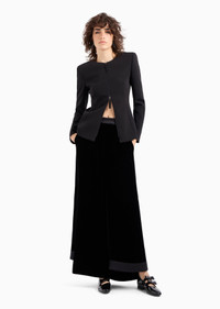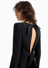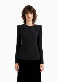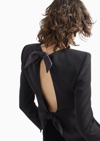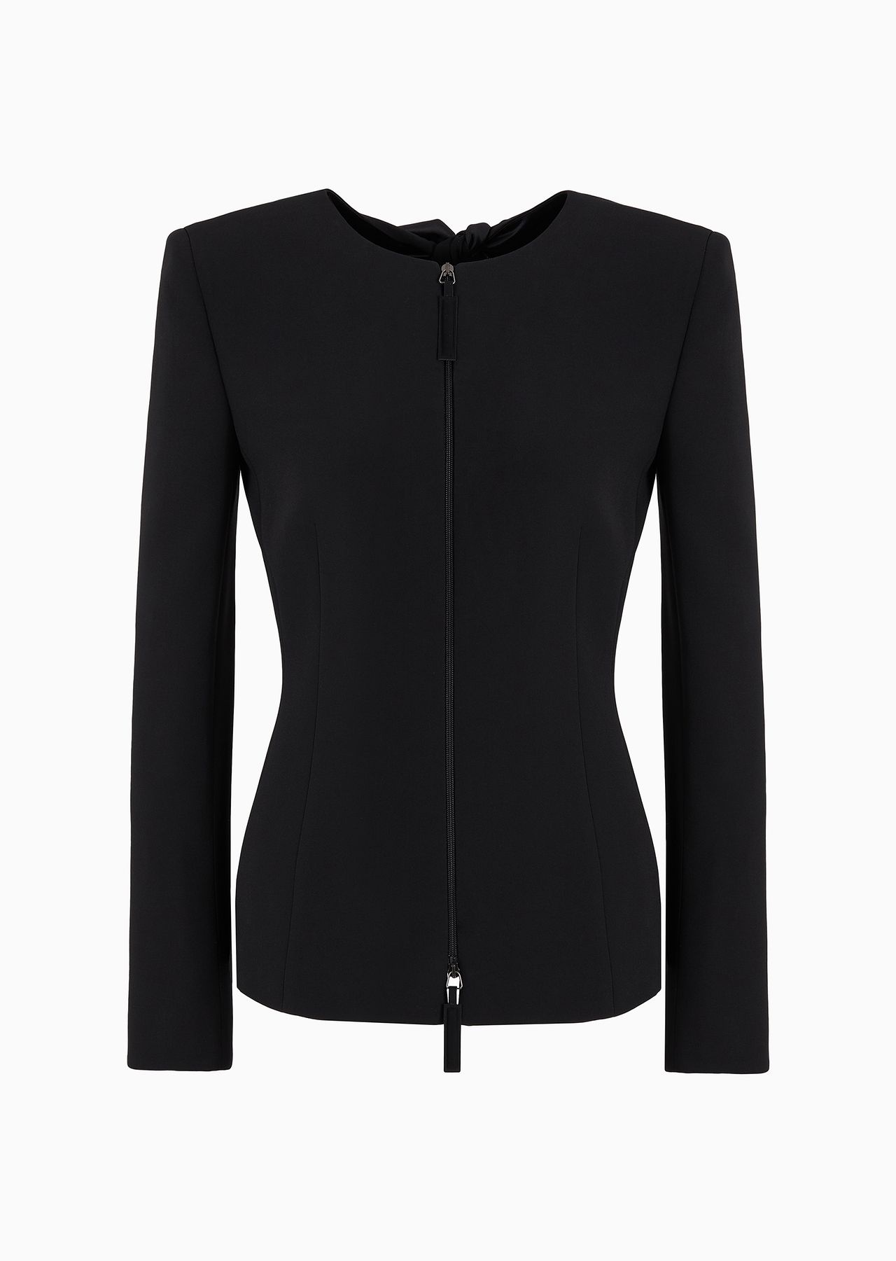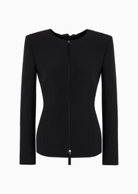 Distinctive jacket made of silk cady, with form-fitting lines that elegantly accentuate the feminine silhouette. The crew-neck style with a zip fastening features a cut-out detail at the back, framed by two silk bows, adding a sensual touch to the piece. Wear it with a top and straight trousers for a sophisticated, refined evening look. Product Code: GW000158TE100711UC001 Details Composition 100% Mulberry silk Slim fit Crew neck Double-slider zip closure Cut-out detail on the back with bows Silk lining Length: 63 cm Made in Italy Fitting The model is 178 cm tall and is wearing size 38/S