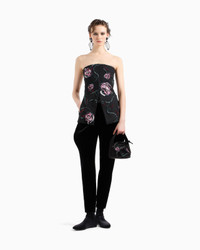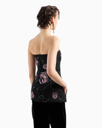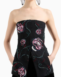 This exquisite bustier top is defined by an elegant and sophisticated shimmer, and its essential, almost geometric line is highlighted by black crystal piping. The style is lit up by a lightweight layer of tulle embellished with rich floral embroidery, created with multicoloured beads, sequins and jet beads. A special piece, the result of expert Made in Italy artisanship, an example of the brand’s expertise in creating unique embroidery with a distinctive charm. Removable shoulder straps Back concealed zip closure Heat-sealed black crystal piping Layer in tulle embroidered with a floral motif created from multicoloured sequins, baguettes, beads and rhinestones Silk lining Internal stays Length: 45 cm Made in Italy Product Code: GW000439AF12236ZZ017