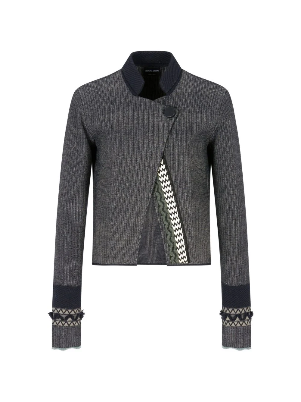 button patterned jacket Highlights - Grey - Ribbed knit - Round button - High neck - Long sleeves - Patterned trim Made in Italy Composition Virgin Wool 39%, Viscose 36%, Polyester 13%, Polyamide 11%, Elastane 1% Washing instructions Read Manufacturer Guidelines