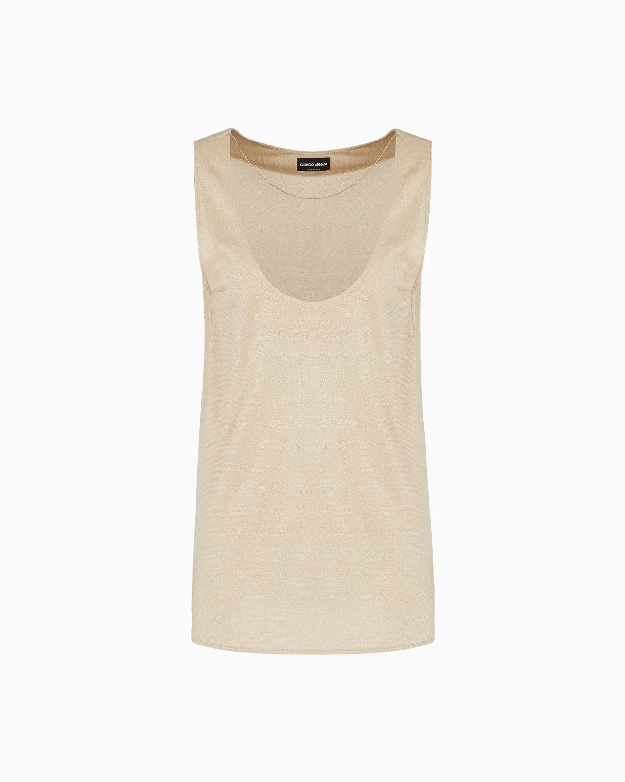 Cosy and lightweight, this top is crafted from lightweight viscose jersey made with a particularly shiny yarn, caressing and elegantly dressing the silhouette. The style features a deep round front neckline, illuminated by a thin gold metal chain, creating a very sophisticated necklace effect. A perfect offering that can be paired with the collection's trousers and skirts. Deep round neckline Gold metal chain detail Side slits Made in Italy Product Code: GW001075AF15523U8048