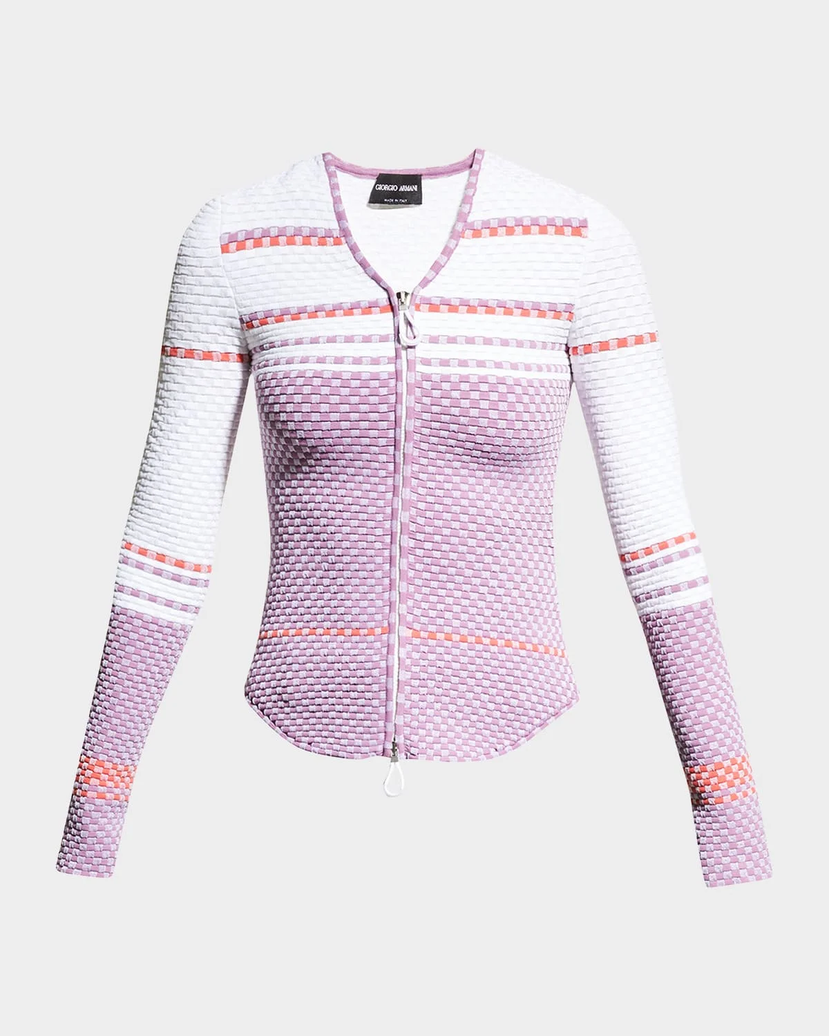 Giorgio Armani jacket in check patterned ottoman jacquard Approx. inseam 50" V neckline; twoway zip front Long sleeves Fitted Shirttail hem Viscose/polyester Dry clean Made in Italy