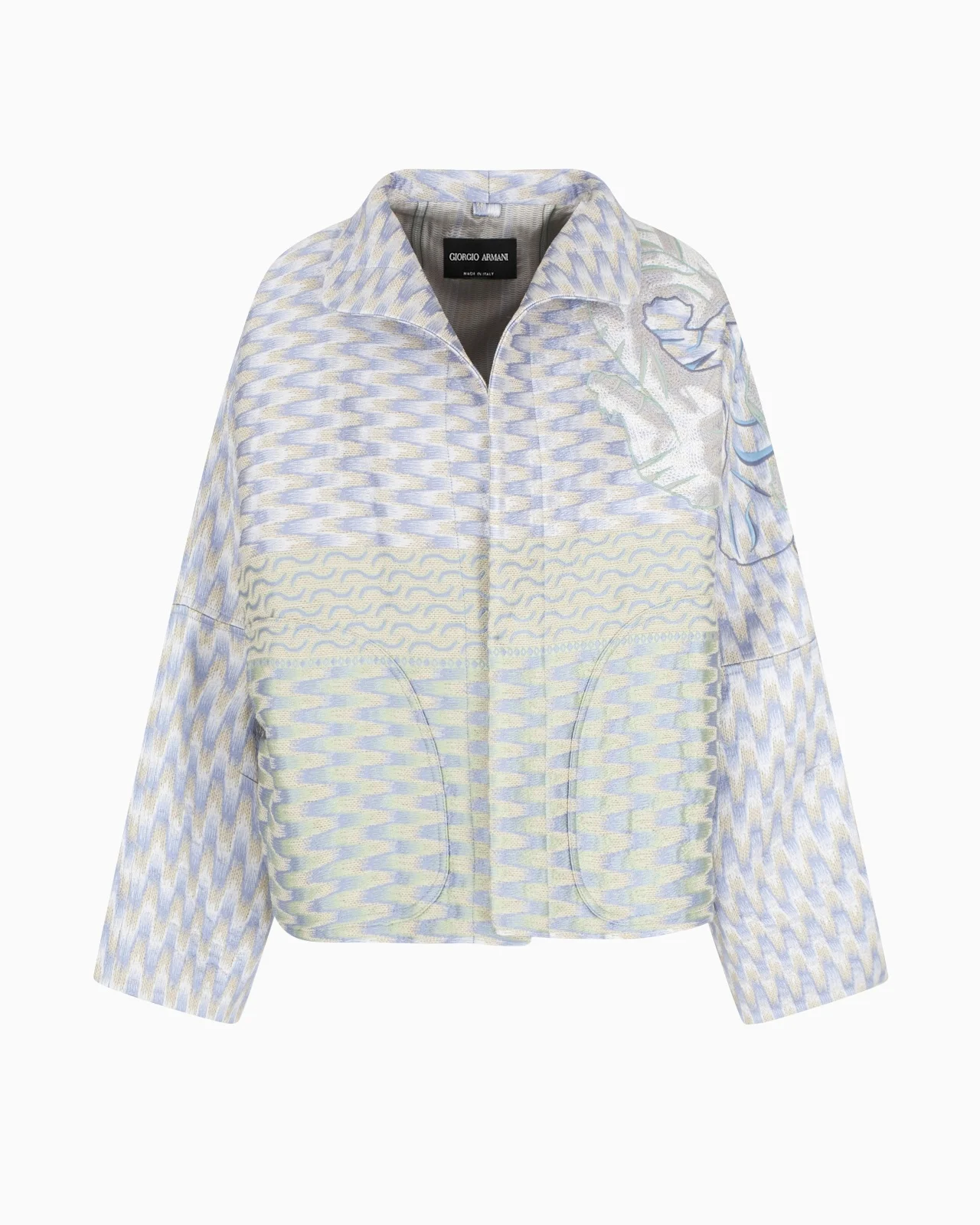 Roomy pea coat made from a sophisticated blend of hemp, linen, and silk, with flared sleeves and large, shaped pockets. A delicate colour palette, with pastel touches and a gradient effect, defines the opulent jacquard that blends East Asian elements with the shape of a sinuous tiger that is a feature of the entire style. An exclusive, distinctive offering, a key piece for sophisticated looks. Invisible press-stud closure Wide flared sleeves Two large, shaped front pockets Lined Length: 57 cm Made in Italy Product Code: GW000920TE14110F6062