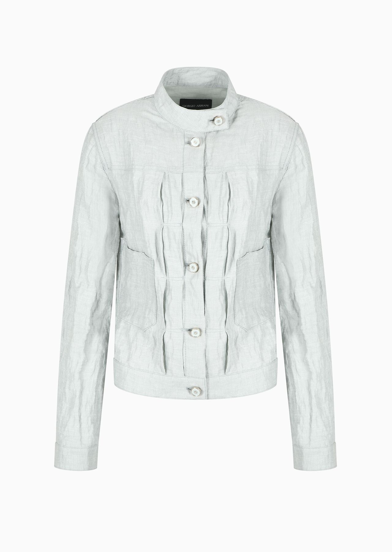 Sophisticated blouson made of cotton and linen, made exquisite by the use of lurex yarn, which adds delicate shimmer. The style features a stand collar, visible button closure and two small shaped front pockets. The horizontal stitching motif accentuates the feminine allure of the piece, the perfect complement to daytime looks. The item is part of the Denim Collection dedicated to denim, featuring a very pale and sophisticated colour palette, oversized volumes embellished with stitching and exquisite details, for a casual yet chic style. Product Code: 4SHGG17ET04VA1U86L Details Composition 67% Cotton 24% Linen 9% Metallic fiber Stand collar with one-button closure Front closure with visible buttons Two shaped patch pockets Buttoned cuffs Matching stitching details Unlined Length: 57 cm from centre back Made in Italy Fitting The model is 178 cm tall and is wearing size 38/S