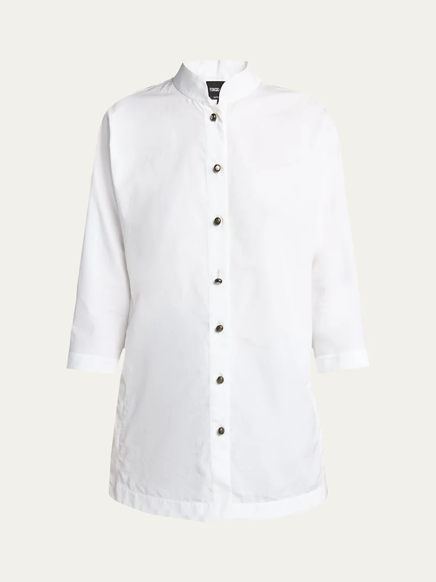 Crafted from crisp cotton poplin, this shirt from Giorgio Armani features monogram buttons Mandarin collar; button front Long sleeves Straight fit Hem falls below the hip Side slits Cotton Dry clean Made in Italy