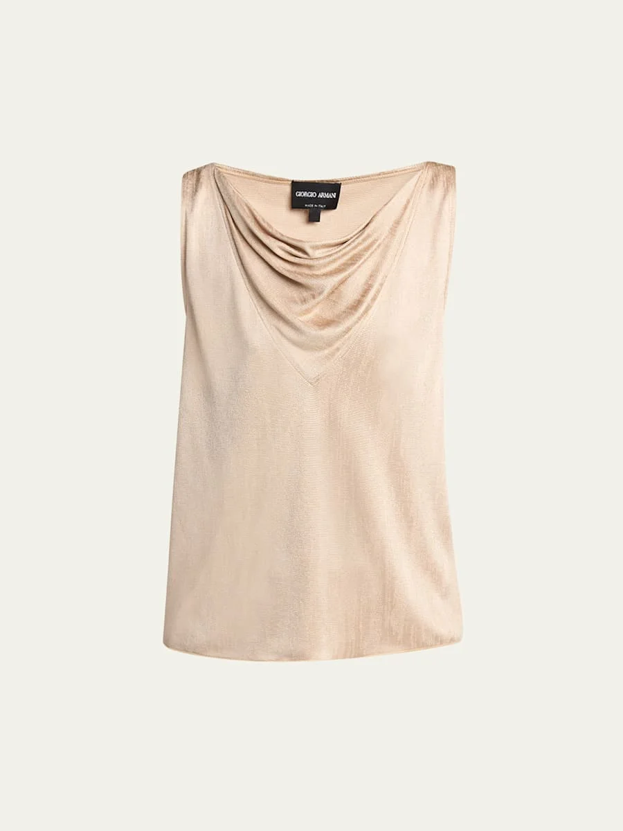 Giorgio Armani top cut from drapey jersey with a metallic finish. Cowl neckline Sleeveless Relaxed fit Pullover style Viscose/elastane Dry clean Made in Italy