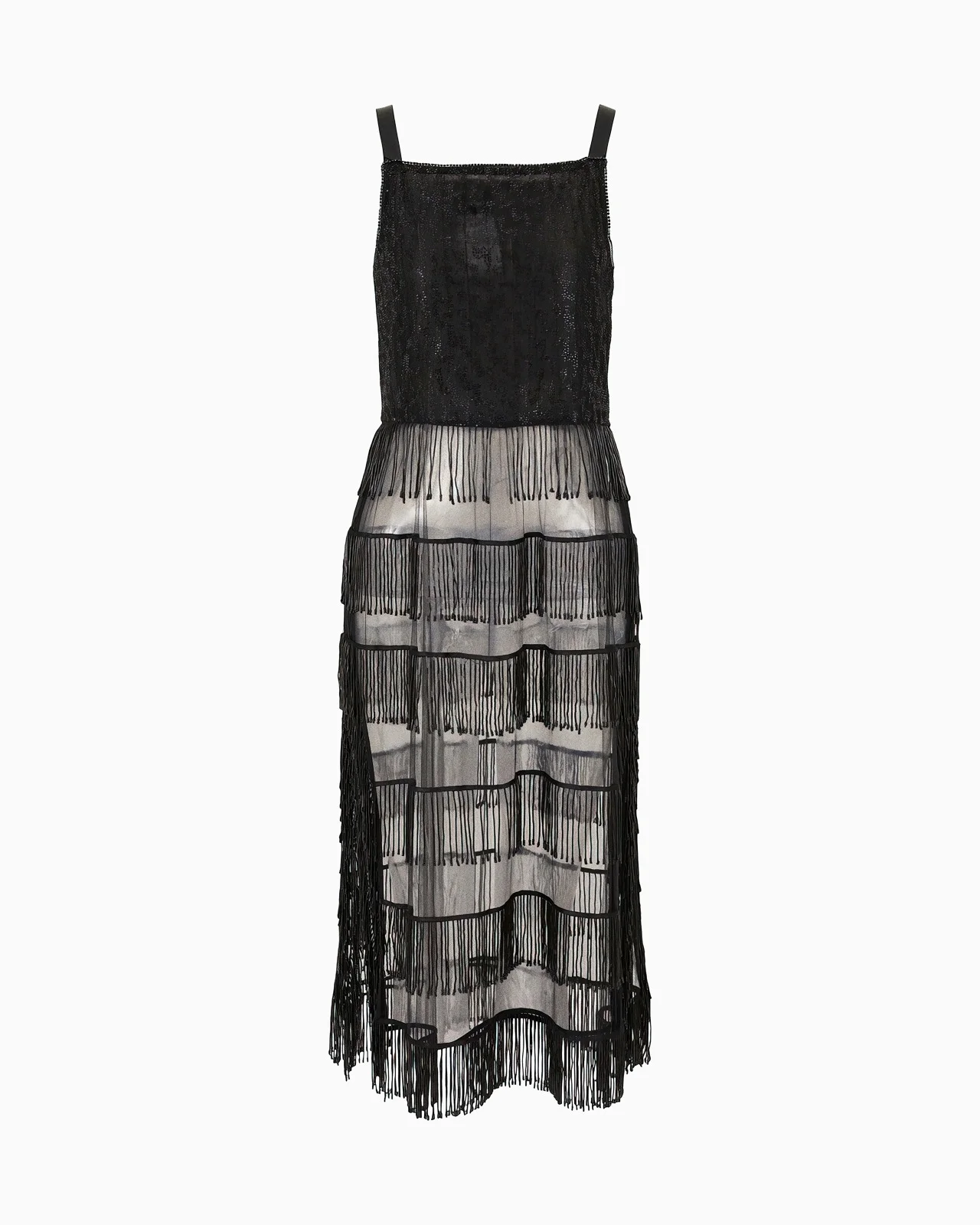 A shower of crystals and baguettes illuminates the sensual, elegant lines of this organza and tulle tunic. This organza bodice style is elevated by a geometric motif of heat-sealed rhinestones, features a skirt with long side slits featuring a horizontal fringe motif that accompany each step. A luxurious, exclusive garment, designed for special occasions. Product Code: 2WHCR029T03TM1PZ01 Details Composition 100% Silk Organza bodice with heat-sealed rhinestones Thin shoulder straps Lower part with two layers of tulle embellished with fringes made of black baguettes Side slits Side concealed zip Made in Italy