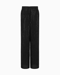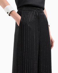 Stylish wide silk trousers with a smooth waistband, concealed closure and side pockets. The style is embellished with rich embroidery made with matching baguettes and sequins, creating a very bright pinstriped motif. A sophisticated offering, designed for finishing evening looks with a special touch. <br>The garment is part of the Holiday selection, which plays with a minimalist colour palette of black and white, colours that have always been a symbol of sophistication. A colour choice found in the fabrics, embroideries and accessories that express the essence of Armani spirit, distinguished by clean, androgynous-inspired lines, that are still always feminine and sensual. Smooth waistband Concealed zip-and-hook closure Two side slant pockets All-over embroidery with matching baguettes and sequins creating a pinstriped motif Unlined Length: 110 cm from the waist Made in Italy Product Code: GW001542AF19945ZZ017