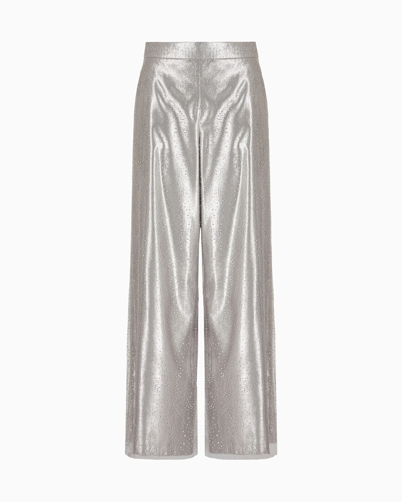 A light tulle layer, embellished with heat-sealed rhinestones, illuminates these silk trousers in a delicate silver shade. The style can be worn with the single-breasted jacket in the same fabric to create a high-impact and extremely sophisticated suit. The garment is part of an exclusive capsule collection dedicated to special occasions, reflecting the iconic vision of elegance through the brand’s style codes. A glamorous item in a white and silver colour palette, with unexpected touches of turquoise, and shimmering embroideries and appliques that provide sophisticated sparkles. Product Code: 4SHPR02PT04RL1PZ01 Details Composition 60% Mulberry silk 40% Polyester Smooth waistband Side zip closure Two side welt pockets Tulle top layer with rhinestone embroidery Made in Italy