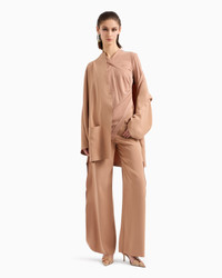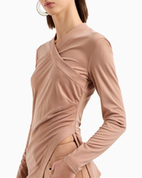 Long-sleeved jumper made of cupro jersey, defined by the asymmetric effect created by the diagonal front panel. A silky, comfortable style to wear that follows the female silhouette without restrictions. A perfect piece to pair with the collection’s trousers. V neck Long sleeves Diagonal front panel Made in Italy Product Code: GW000912AF15057U6090