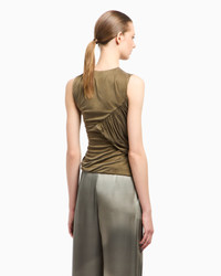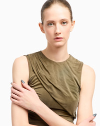 Top made of cupro jersey, a special fibre selected for its distinctive fluid, almost liquid appearance, a prominent feature of the brand’s clothing. A natural-origin fibre, it is subsequently enzyme treated to give it a silky touch. The style features an asymmetric drape starting at one shoulder, creating a play of pleats and volumes that elegantly accentuate the silhouette. A sophisticated, feminine piece that is perfect paired with the skirts and trousers from the collection. Crew neck Sleeveless design Front draping Made in Italy Product Code: GW002163AF19850U8101