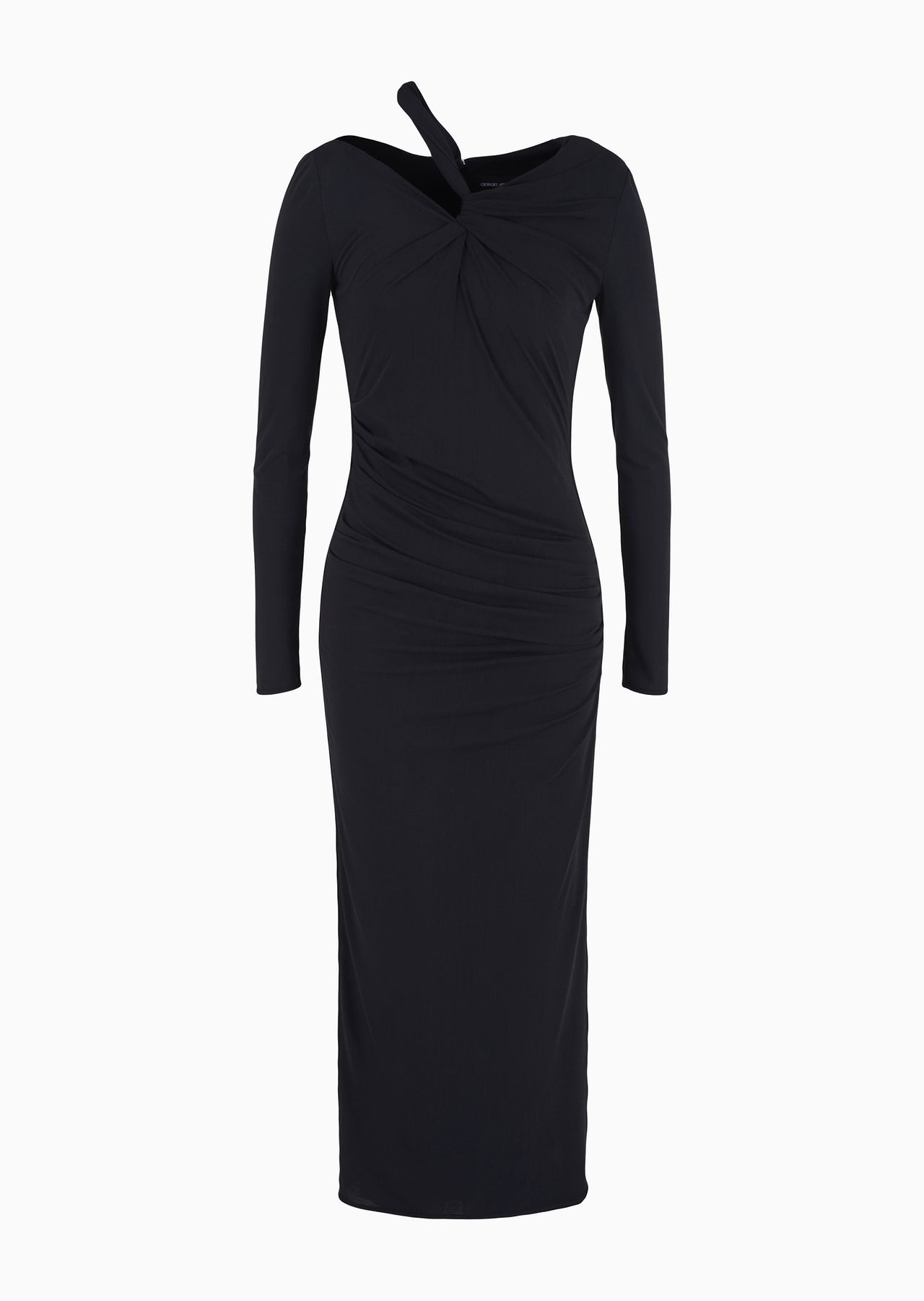 Sleek, refined midi dress, featuring a slim fit that accents and enhances the silhouette. The style is embellished with a neckline with a draped, cut-out detail and gathering at the sides. This sophisticated style can be worn for day or evening looks, simply by changing accessories. Product Code: 3DAA52AJJEZ1U8SL Details Composition 94% Cupro 6% Elastane Crossover neckline with draped detail Long sleeves Sewn side tape detail Gathering at the sides Back central zip fastening Length: 124 cm Made in Italy Fitting The model is 178 cm tall and is wearing size 38/S