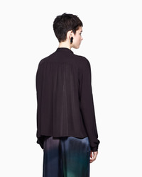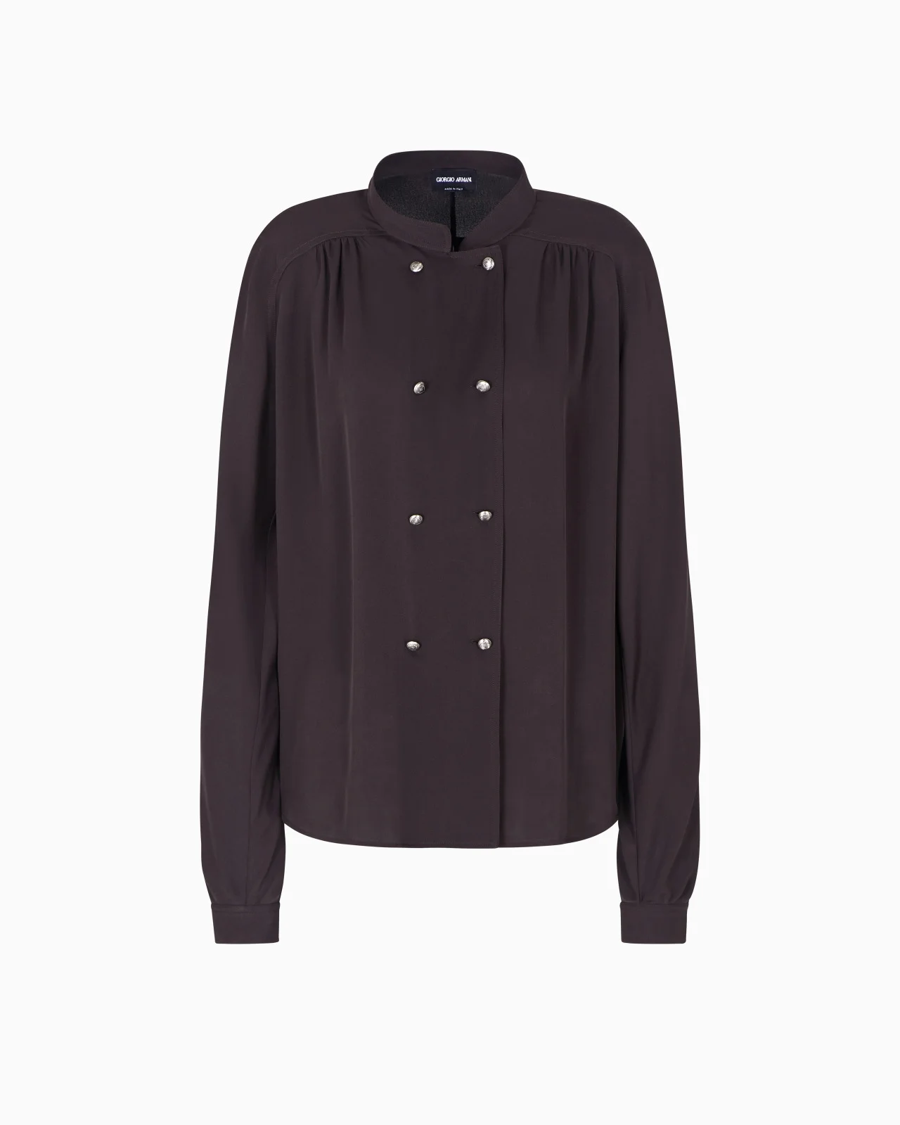 Sophisticated shirt made of triple silk georgette, a flowing fabric that is light as a feather, with a slightly textured feel that caresses the skin. The style is distinguished by its relaxed, flowing silhouette, defined by a guru collar and double-breasted closure with exposed metal buttons. A modern interpretation of a classic piece, perfect for completing daytime looks with a sophisticated touch. Guru collar Long sleeves Gathering detail on the shoulders Double-breasted closure with eight buttons Single-buttoned cuffs Contoured back yoke Made in Italy Product Code: GW001763TE10814U8130