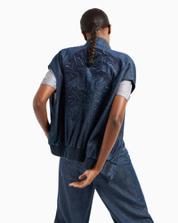 Relaxed, unstructured lines for this distinctive blouson made from Lyocell denim. The sleeveless style has an upright collar, concealed fastening and elasticated hem. The sophisticated urban tiger-themed embroidery on the back elevates this piece from the Denim Collection. A selection that interprets the world of denim through the brand’s signature style. Silky-soft yarns and a versatile colour palette: denim is seen in a whole new light, as more feminine and luxurious. Upright collar Sleeveless design Faced placket Breast pocket Two side pockets Matching urban tiger embroidered detail Silk lining Made in Italy Product Code: GW001342AF15323UB112