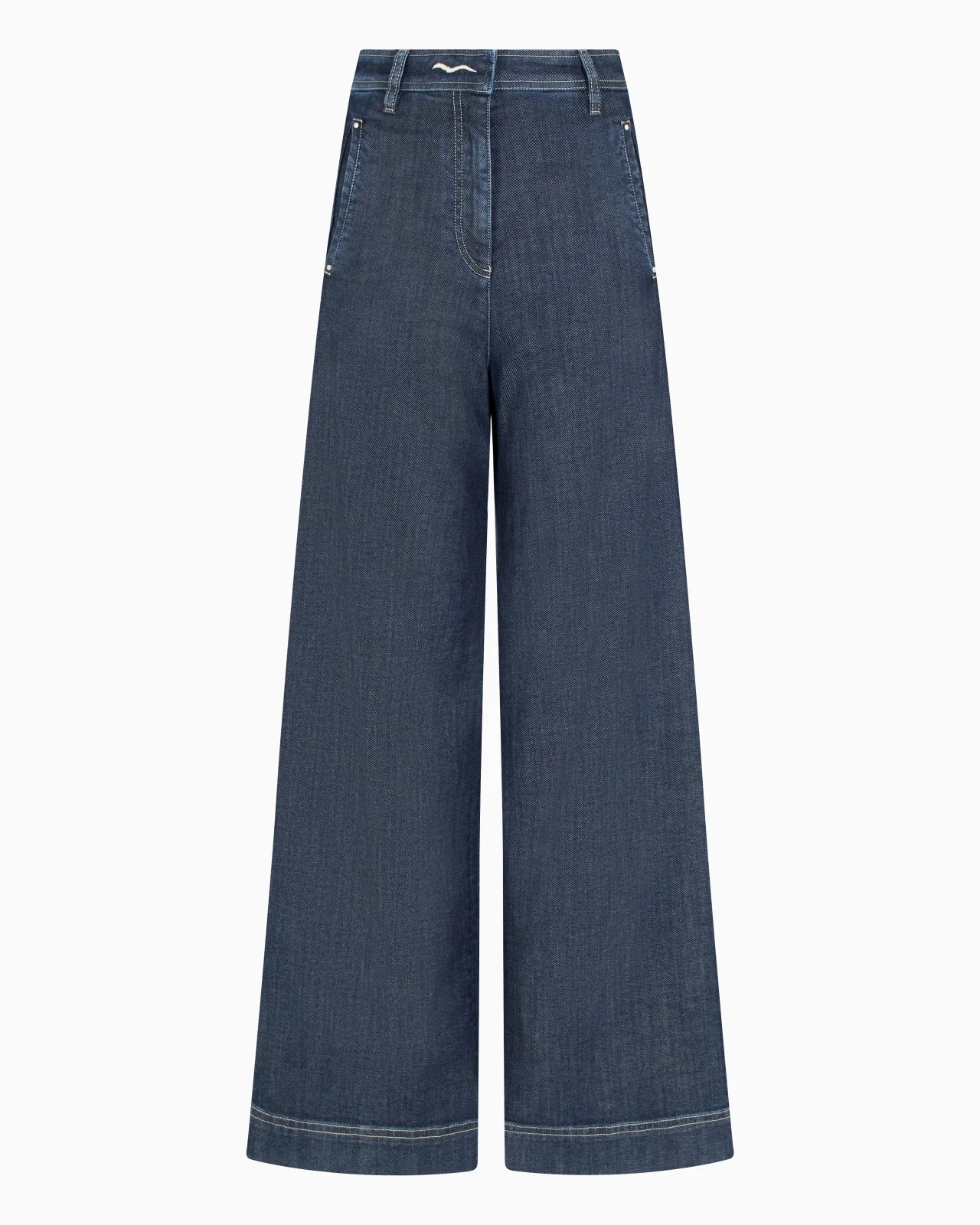 Wide-leg trousers made from stretch-cotton denim, with a comfortable fit and soft feel. The high-waisted style with topstitched side pockets is customised with a contrasting, embroidered GA logo on the back pocket, recalling other pieces from the collection. Extremely versatile, perfectly completing a wide array of looks. The piece is part of the Denim Collection, which interprets the world of denim through the brand’s iconic style. Silky-soft yarns and a versatile colour palette: denim is seen in a whole new light, as more feminine and luxurious. High waisted Button and zip fastening Two side pockets Two back patch pockets Contrasting embroidered GA logo Made in Italy Product Code: GW000934AF15303UB108