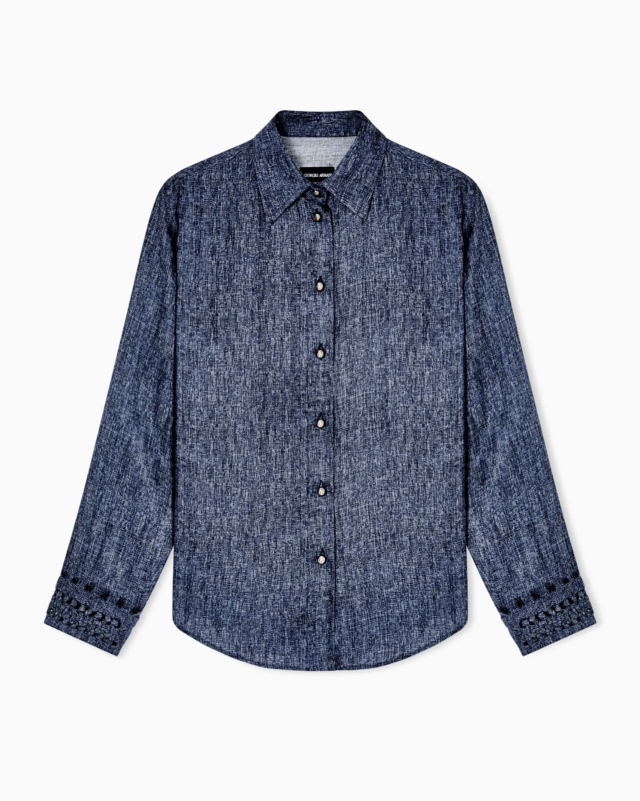 Shirt with classic collar and front buttoning, made of silk and defined by a denim-effect print that enhances the exclusivity of the garment. A versatile and sophisticated item, with perforated detail on the cuffs, perfect for day to night looks. The piece is part of the Denim Collection, which interprets the world of denim through the brand’s iconic style. This selection features rich blue denims and relaxed sportswear-inspired shapes that offer laid-back but sophisticated style. Classic collar Exposed button closure Cuff detail with perforated workmanship Unlined Made in Italy Product Code: GW003064TE20175MB029