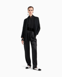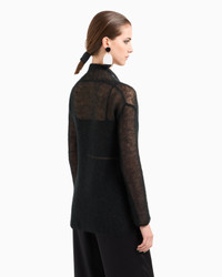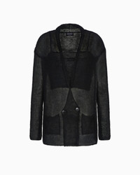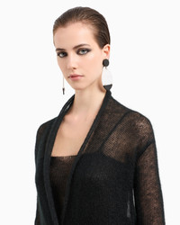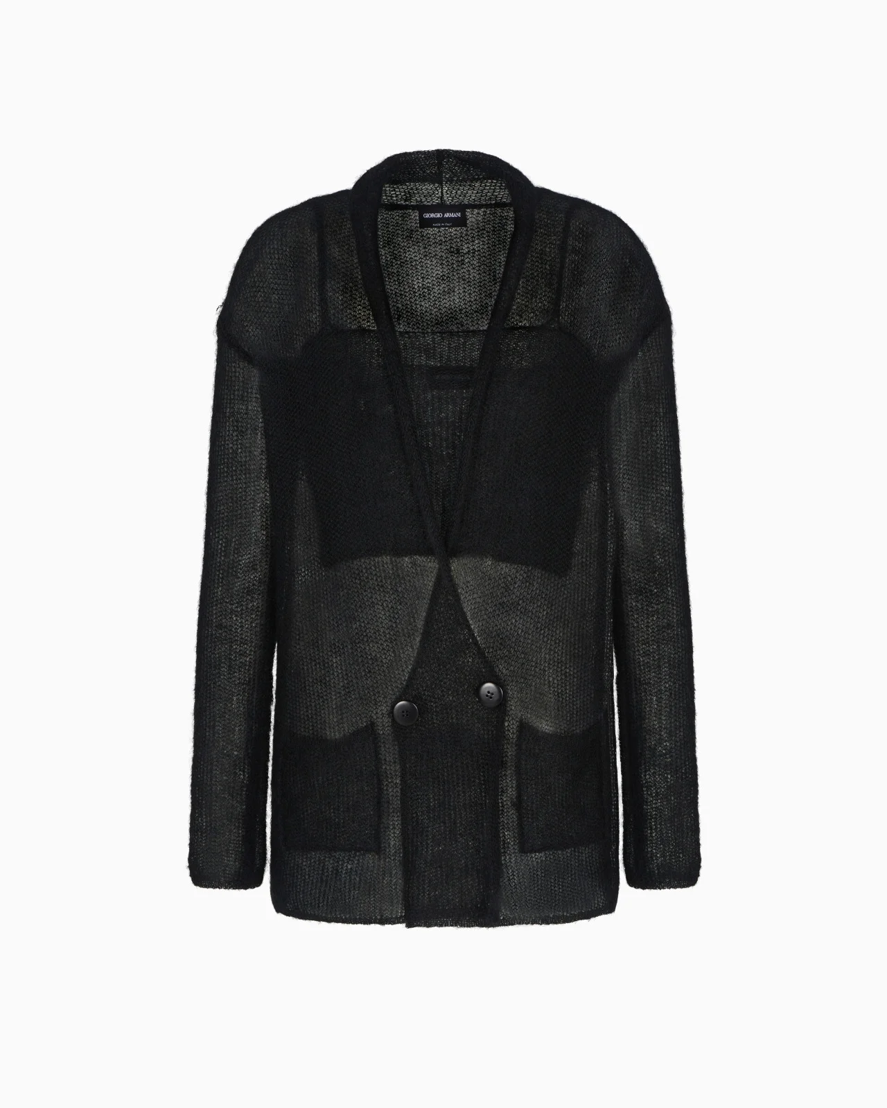 This double-breasted cardigan is crafted from a mohair wool blend and features a relaxed, flowing silhouette enhanced by a mesh knit. Paired with a minimalist top with thin straps to create a versatile twinset with a laid-back spirit for daytime wear.<br>The garment is part of the Holiday selection, which plays with a minimalist colour palette of black and white, colours that have always been a symbol of sophistication. A colour choice found in the fabrics, embroideries and accessories that express the essence of Armani spirit, distinguished by clean, androgynous-inspired lines, that are still always feminine and sensual. Fineness: 12 Twin-set consisting of: Double-breasted cardigan with patch pockets and two-button closure Top with thin shoulder straps Made in Italy Product Code: GW002229AF20120UC001