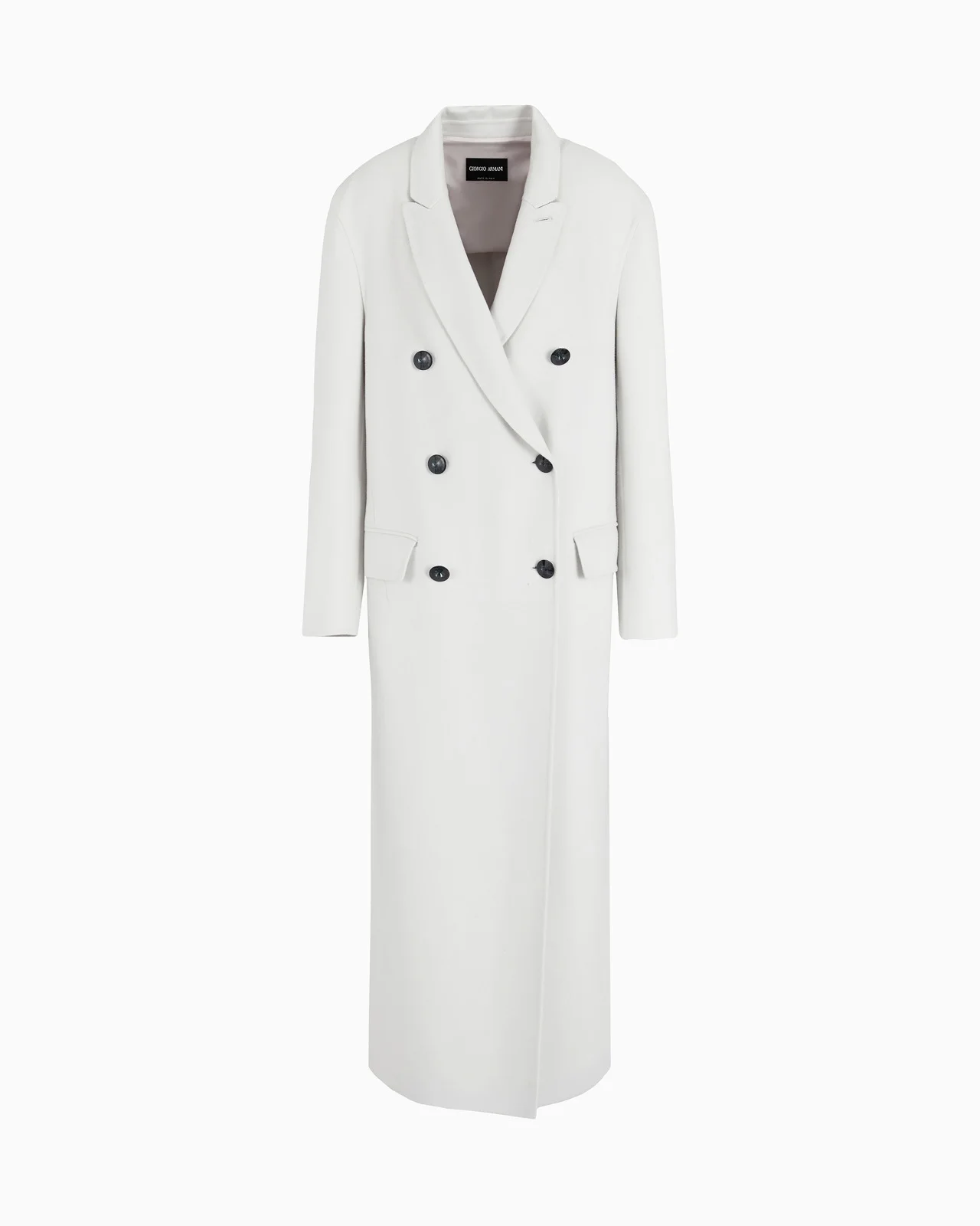Long coat made from double-faced cashmere, making it perfect in formal or less formal looks. The style, with its unmistakable design and elegance, features a six-button double-breasted closure, rounded peak lapels and flap pockets. It is the embodiment of the brand’s hallmark sophisticated, refined style. Product Code: GW000465TE101121U9306 Details Composition 100% Cashmere Double-breasted coat Rounded peak lapels Double-breasted six-button closure Two flap pockets Two-button martingale detail Central back vent Bonded fabric Length: 135 cm Made in Italy Fitting The model is 178 cm tall and is wearing size 38/S