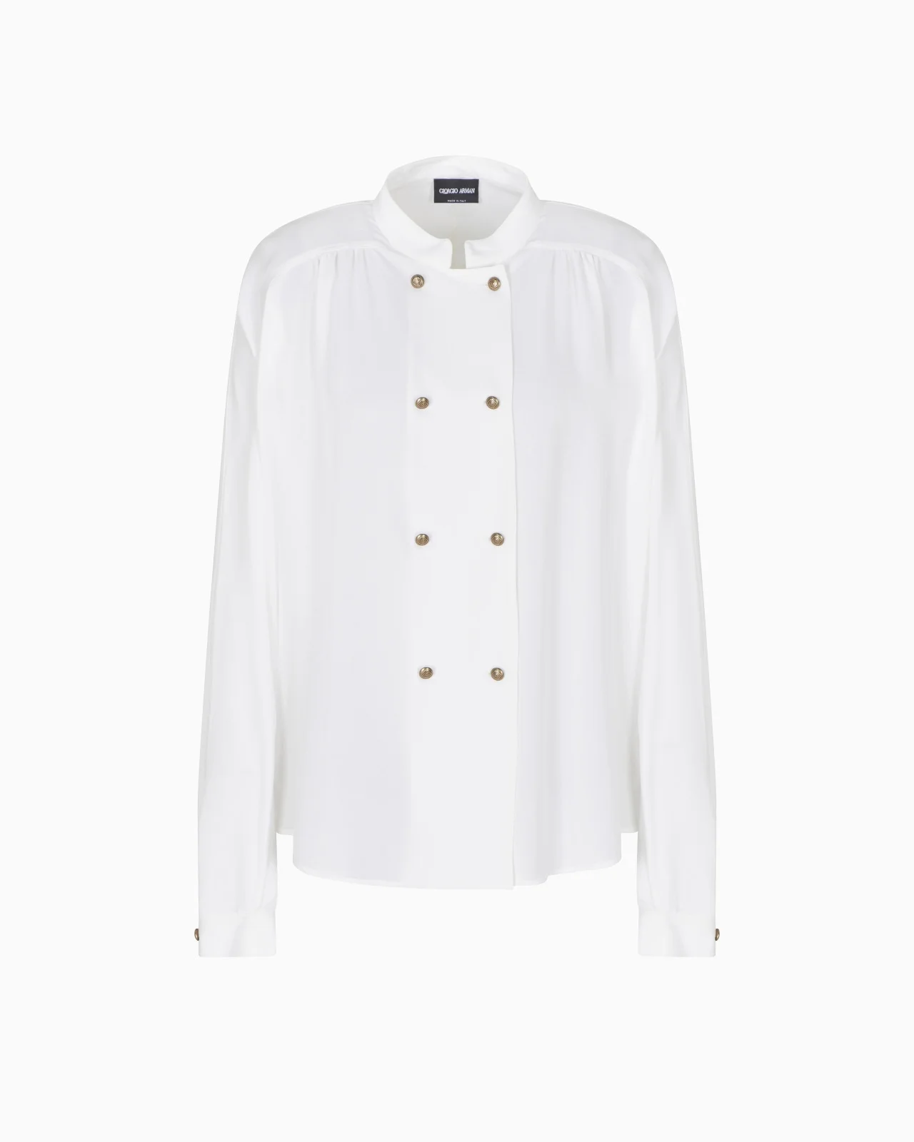 Sophisticated shirt made of triple silk georgette, a flowing fabric that is light as a feather, with a slightly textured feel that caresses the skin. The style is distinguished by its relaxed, flowing silhouette, defined by a guru collar and double-breasted closure with exposed metal buttons. A modern interpretation of a classic piece, perfect for completing daytime looks with a sophisticated touch. Guru collar Long sleeves Gathering detail on the shoulders Double-breasted closure with eight buttons Single-buttoned cuffs Contoured back yoke Made in Italy Product Code: GW001763TE10814U1144