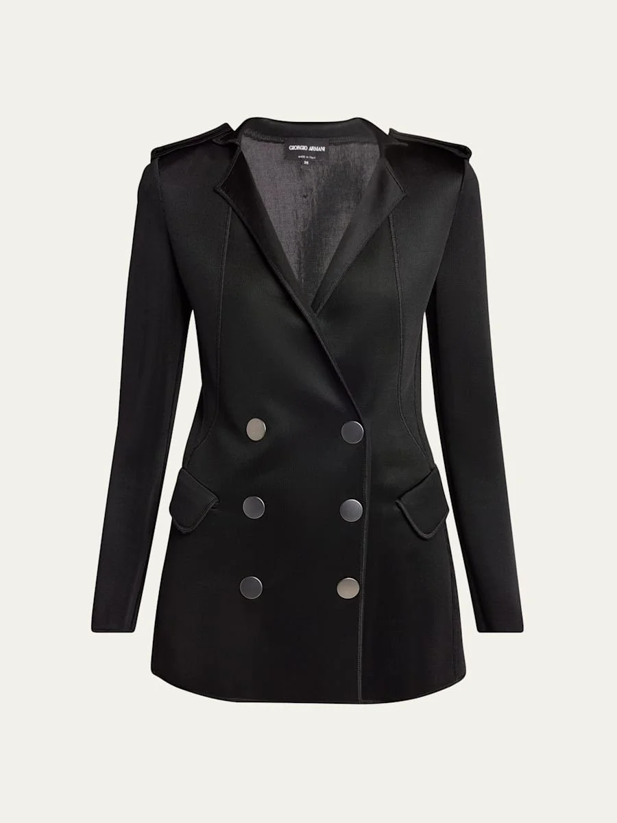 Giorgio Armani blazer crafted in viscose jersey with metallic buttons Notched lapels; double-breasted front Shoulder epaulettes Long sleeves Front flap pockets Double-vented back Tailored fit Viscose/elastane Dry clean Made in Italy Online Inquiries: BGS21_BA3HM| Store Inquiries: #5025074