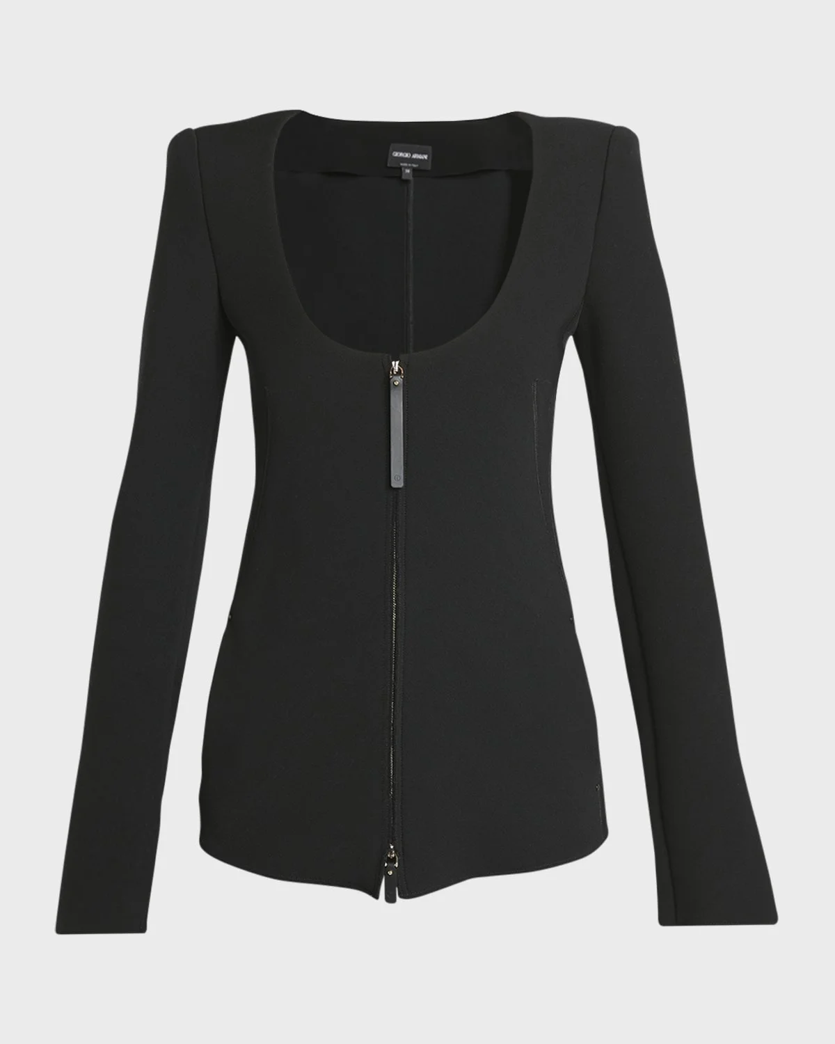 Giorgio Armani tailored jersey jacket with leather zipper pulls Scoop neckline; twoway zip front Long zip sleeves Slim fit Hip length Virgin wool Dry clean Made in Italy