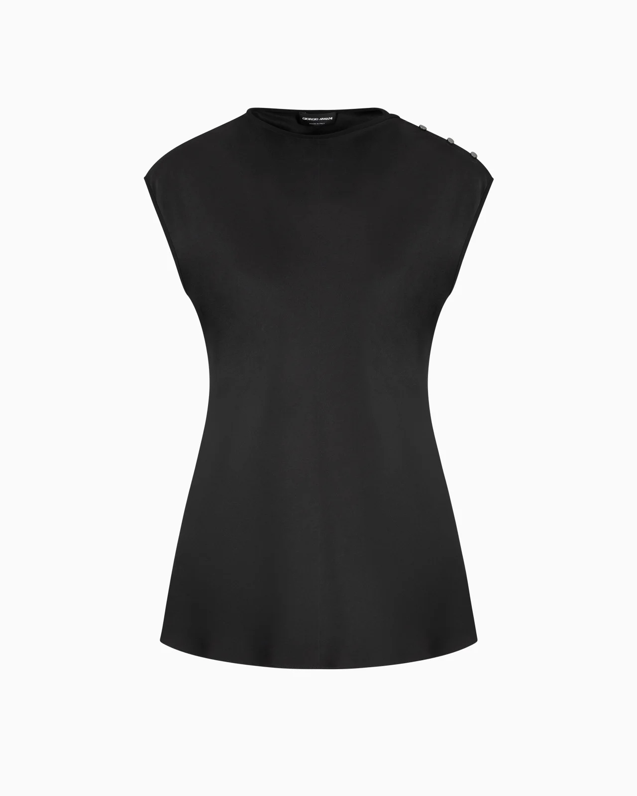 Elegant blouse made of double silk satin, featuring a slinky, relaxed fit. With a slightly stand collar and cap sleeves, the style is embellished with a small contoured panel detail on the left shoulder, which can be worn on the front or on the shoulder. A versatile item that perfectly complements the collection's trousers and skirts. Slight upright collar Cap sleeves Small contoured panel detail on shoulder, press-stud closure Made in Italy Product Code: GW000686TE10101UC001