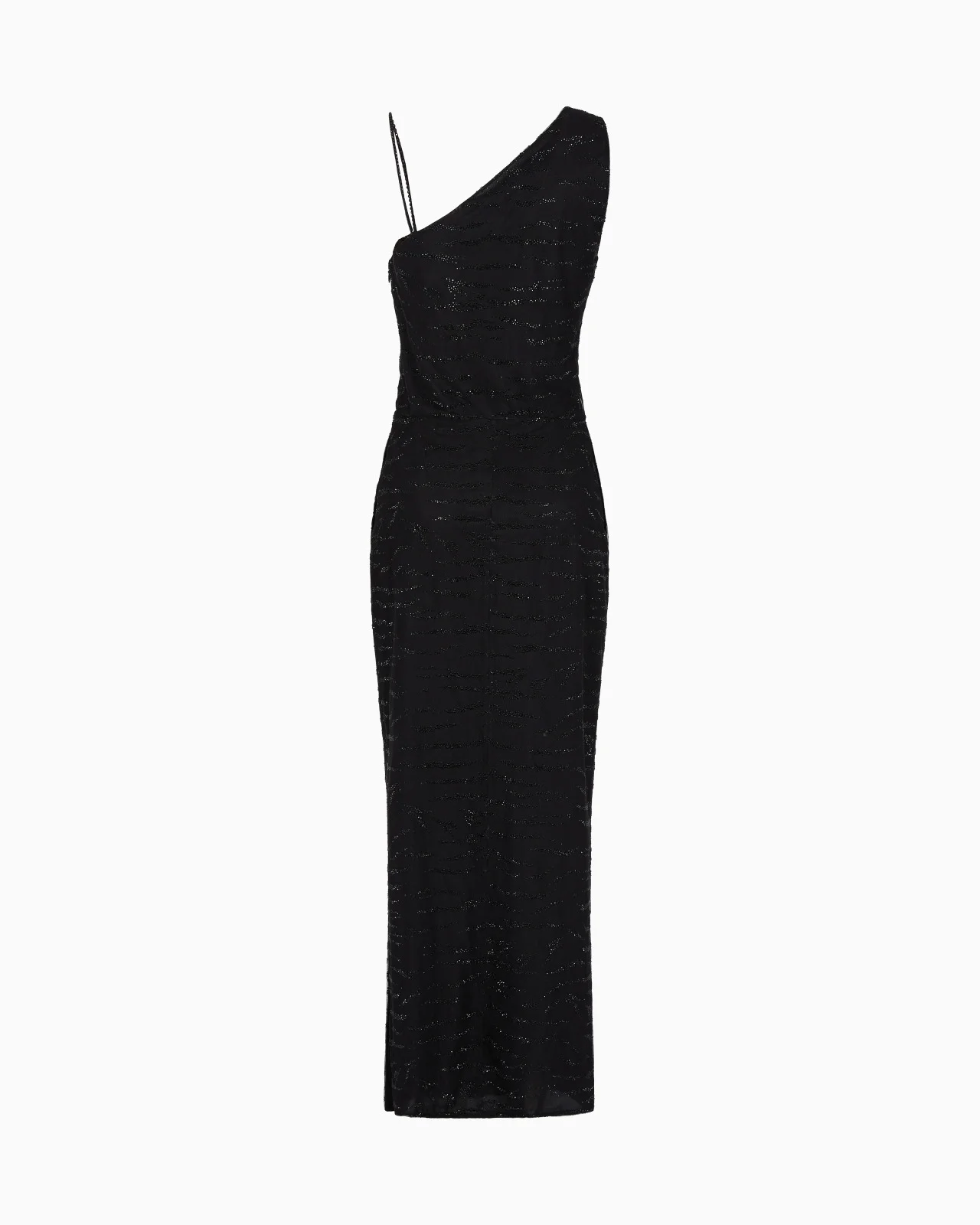 Lustrous and luxurious, this long dress in black silk and lights up with delicate shimmers thanks to the heat-sealed rhinestone embroidery. The style, which creates a one-shoulder effect, is embellished with a flower detail applied on the neckline and side slits to add movement. A sophisticated and elegant offering, perfect for dressing up the most special occasions. Black silk base with a tulle overlay with all-over black heat-sealed rhinestone embroidery One-shoulder effect Flower detail and thin shoulder strap covered in heat-sealed black rhinestones Concealed side zip closure Side slits in the hem Lined Made in Italy Product Code: GW000681AF14781ZZ017