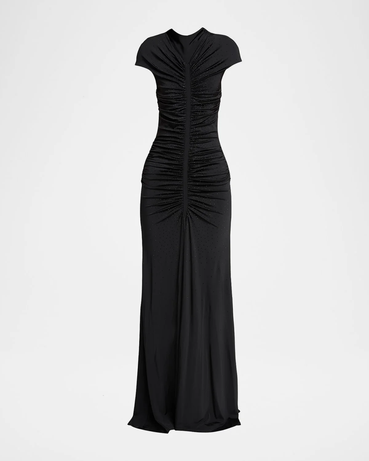 Glittering with rhinestones, this Giorgio Armani gown is defined by the luxurious ruching on the front and back for a close figure-hugging fit High neckline Cap sleeves Full length A-line silhouette Invisible back zipper Viscose/elastane Dry clean Made in Italy