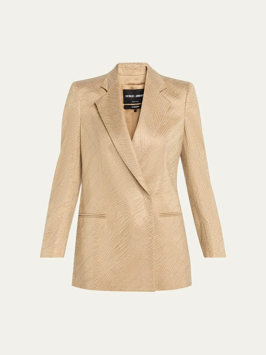 Crafted from lustrous silk, this blazer jacket from Giorgio Armani shimmers with allover wavy strass embellishment Notch lapels; doublebreasted front Long sleeves Padded shoulders Hip double welt pockets Straight fit Hem falls below the hip Concealed front closure Silk/nylon/polyamide Made in Italy SIZE amp; FITModel measurements: 5'10" tall Model is wearing a US size 4/Small
