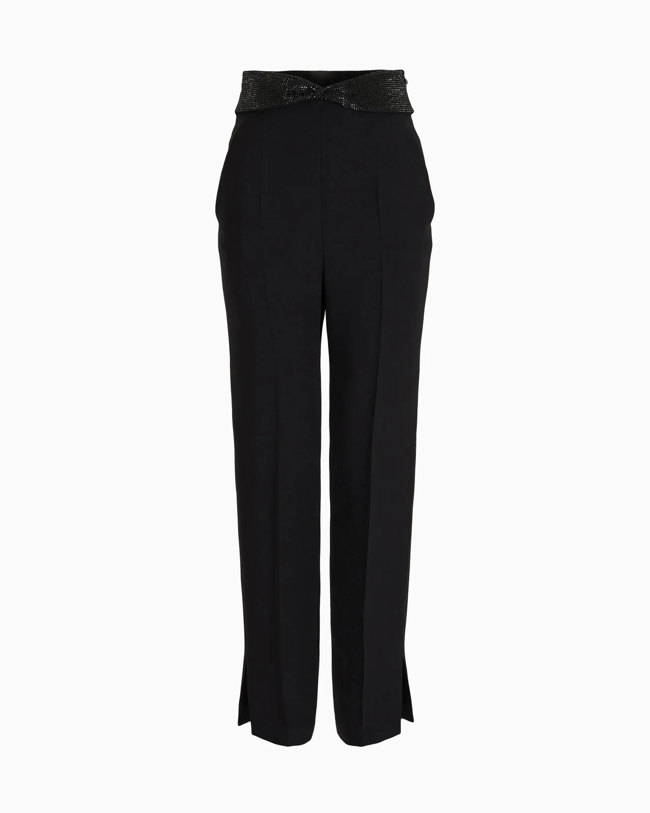 Elegant, straight trousers made of silk cady. The relaxed-volume style is embellished with a waistband covered all over by a pave of heat-sealed rhinestones with openwork. Perfect for brightening up evening looks with a touch of sophistication. Product Code: 4SHPR02RT04UA1PZ01 Details Composition 100% Mulberry silk Waistband detail with a pave of heat-sealed rhinestones with openwork Two side pockets Side fastening with concealed zip Small slits in the hem Unlined Made in Italy Fitting The model is 178 cm tall and is wearing size 38/S