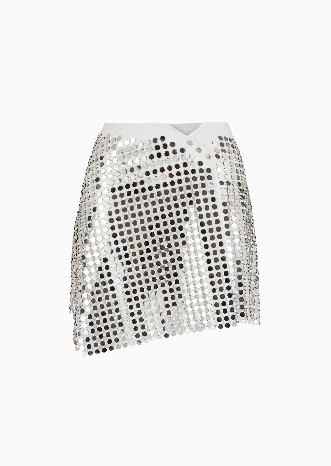 Shimmering top made from double jersey with clean lines. With shoulder straps and a three small button closure, the style is characterised by the rich laser-cut embroidery embellished with heat-adhesive mirrors and highlights. Designed to catch the light—and every eye—at exclusive parties, it can be paired with the miniskirt in the same fabric to create a bright, striking total look. The garment is part of an exclusive capsule collection dedicated to special occasions, reflecting the iconic vision of elegance through the brand’s style codes. A glamorous item in a white and silver colour palette, with unexpected touches of turquoise, and shimmering embroideries and appliques that provide sophisticated sparkles. Product Code: 3DAN80AJCTZ1U13Q Details Composition 74% Polyester 26% Elastane Wrap closure with buttons Asymmetric hem Laser-cut embroidery embellished with heat-adhesive mirrors and highlights Made in Italy