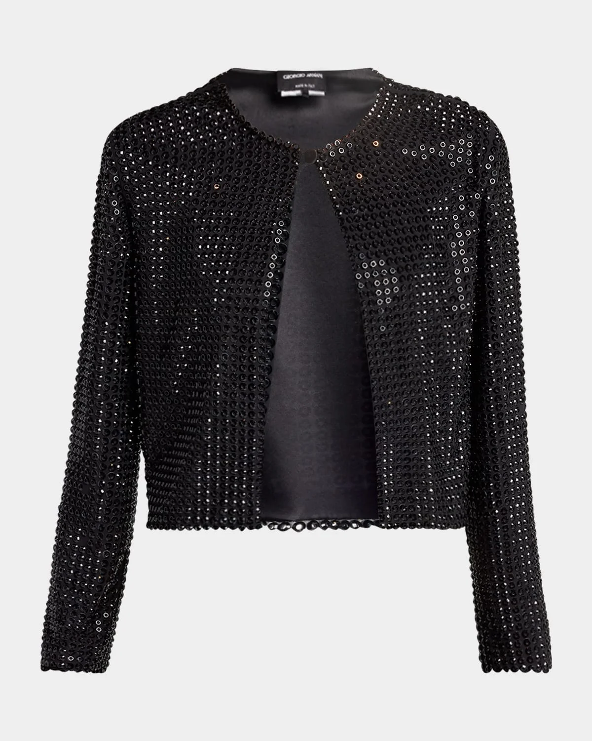 - Giorgio Armani silk topper jacket embellished with a crystal ring embroidery - Crew neckline; single-button neck - Long sleeves - Relaxed fit - Hip length - Button closure - Polyester - Dry clean - Made in Italy