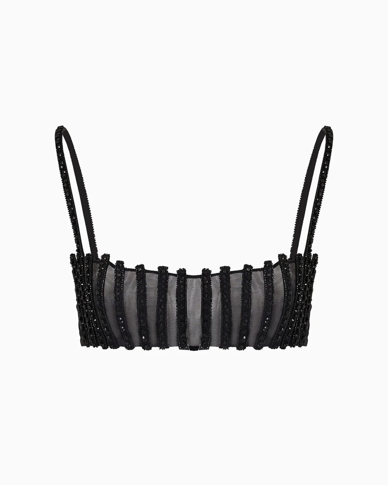 Gleaming, sensual bandeau top made of tulle, designed for special occasions. The style is distinguished by embroidery created from black baguettes and jets that trim the bodice stays, creating a highly sophisticated see-through effect. The thin straps, illuminated by a pave of crystals, complete an exquisite item, perfect under a jacket or worn as a star of evening looks. Thin shoulder straps embroidered with black crystals Tulle base with stays embroidered with black baguettes and jets Adjustable back closure Unlined Made in Italy Product Code: GW000942AF14964ZZ017