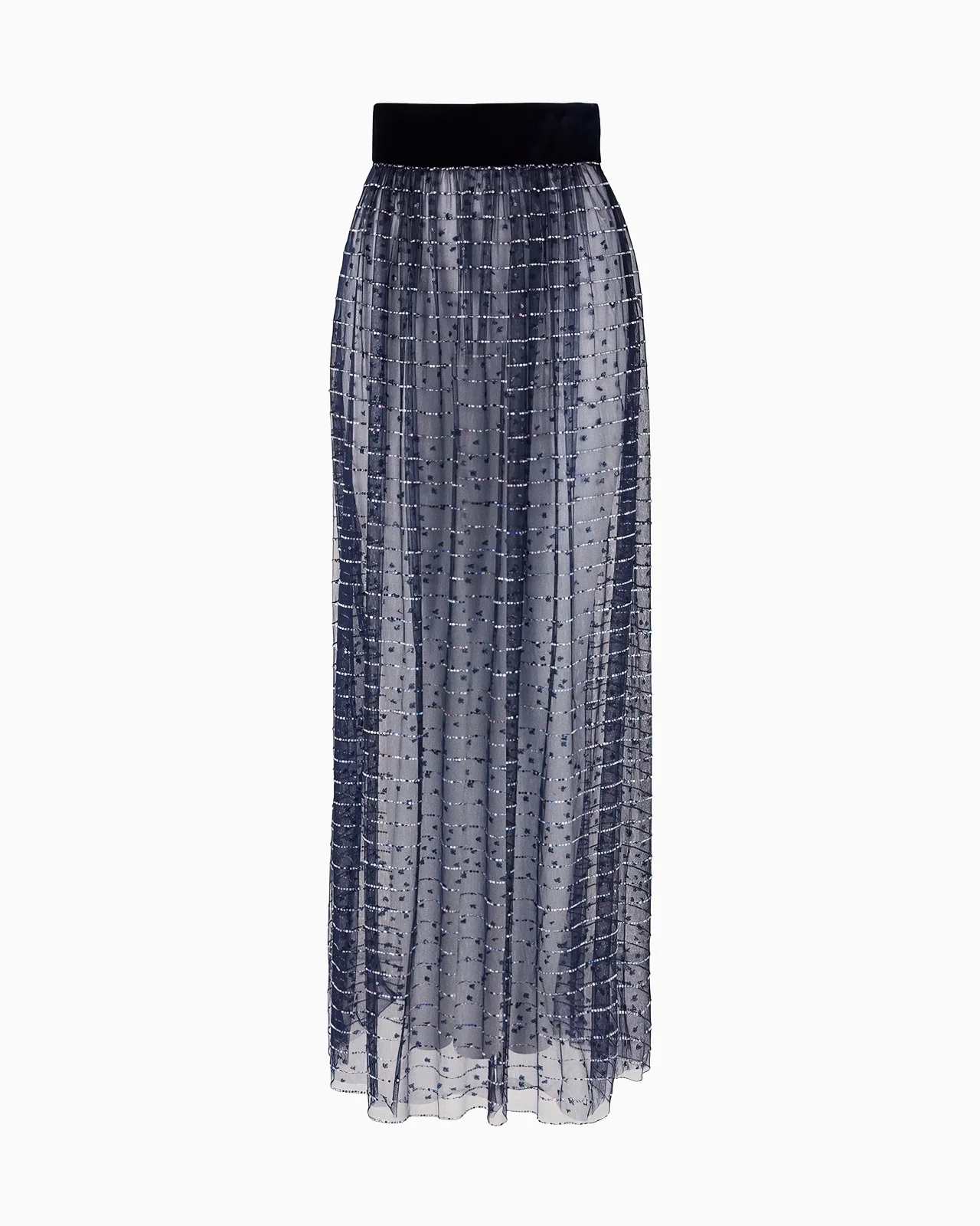 Exquisite, radiant evening maxi skirt crafted in tulle and embroidered with monochromatic rhinestones. A style with a romantic, ethereal appeal, the result of an all-Italian construction that creates a garment with evocative sparkles, adding movement to the wearer’s silhouette. A sumptuous item that leaves its mark in one-of-a-kind looks. Product Code: 2WHNR00UT03TG1PZ01 Details Composition 100% Polyamide Velvet strap Gathered waist Horizontal-striped heat-sealed multicoloured rhinestone embroidery Lined Length: 105 cm Made in Italy