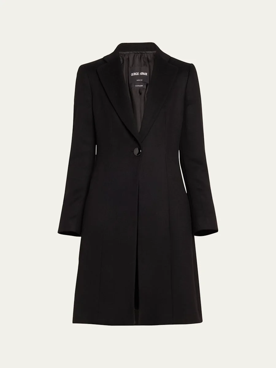 Giorgio Armani knit coat Notch lapels; one-button front Long sleeves Side pockets Tailored fit Cashmere Made in Italy Model is 5'10"/177cm. Online Inquiries: BGS21_B9ERC| Store Inquiries: #4857162
