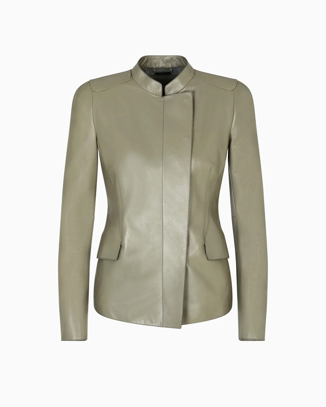 Elegant short jacket made from supple lambskin, known for its natural lightness and silky feel. The style is distinguished by its clean, fitted shape, enhanced by a guru collar, asymmetric front zip fastening and flap pockets. A perfect piece for adding a bold yet sophisticated touch to daytime outfits. Form-fitting cut Upright collar Diagonal placket with concealed press studs Long sleeves Two front flap pockets Slightly darker edge stitching Cuff closure with flat-head press-studs covered in nappa leather Gunmetal plating Stretch twill lining Length: 56 cm Made in Italy Product Code: GW002055AF19607U6274