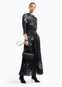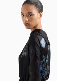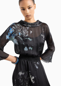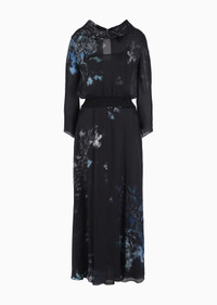 The sophisticated floral print in deep, full-bodied colours, adds elegance to the lines of this long dress crafted from silk charmeuse. Featuring a funnel neck, long sleeves and smocked detailing that highlights the waist, it is distinctive thanks to the relaxed, slinky lines that drape over the silhouette. “Black Shadows”, the recurring theme of this part of the collection, is inspired by winter gardens and showcases fading, gradient and ethereal motifs in night-time, intense shades that embellish the collection pieces. Product Code: GW000256TE108601FC005 Details Composition 100% Mulberry silk Cosy funnel neck Long sleeves Zip closure Smocking detail at the waist Unlined Length: 105 cm from the waist Comes with a matching slip Made in Italy Fitting The model is 178 cm tall and is wearing size 38/S