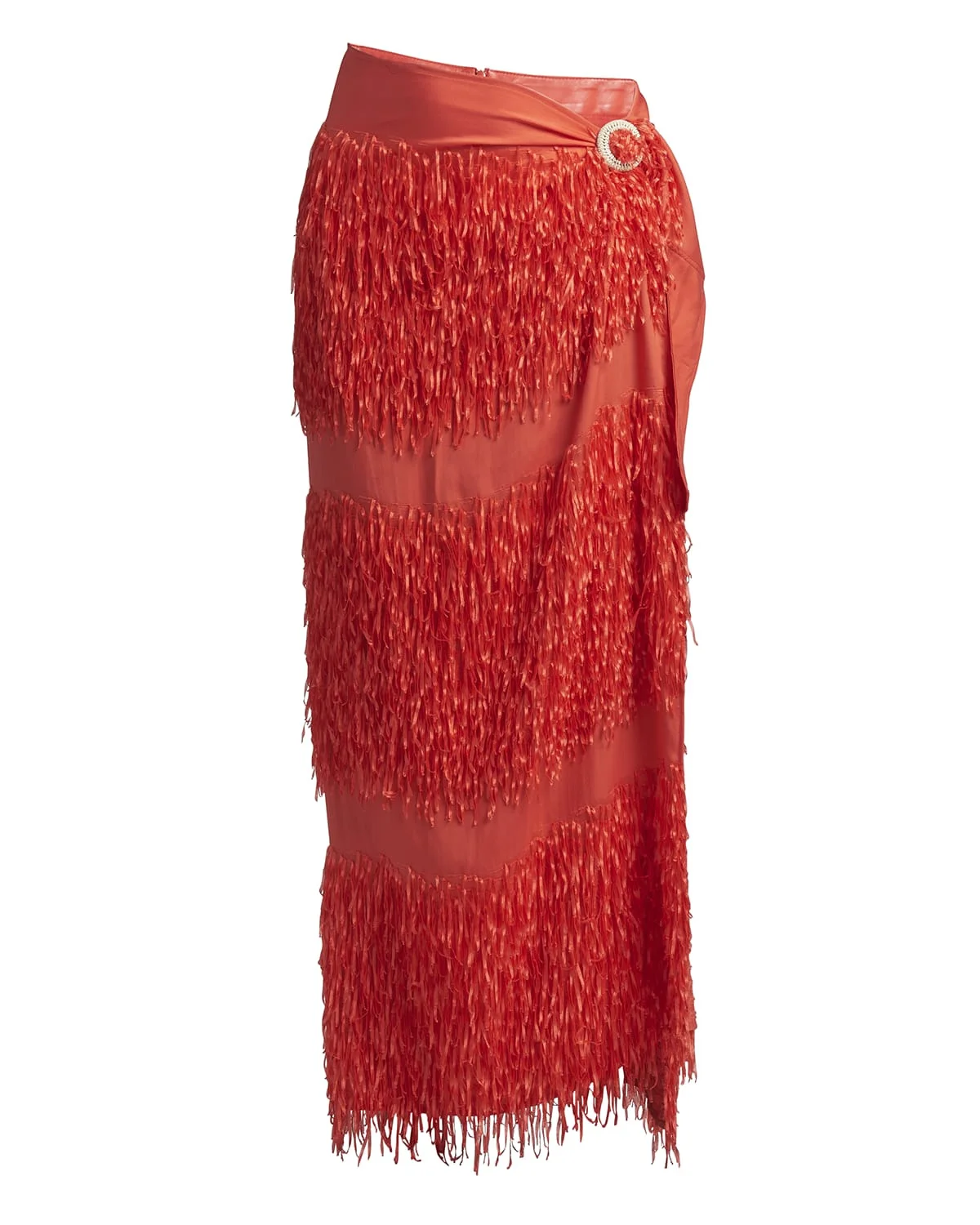 Giorgio Armani sarong skirt with fringe detail High waist Straight silhouette Hem falls below the knee Side slit hem Side buckle closure Cotton Made in Italy