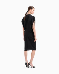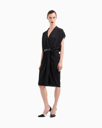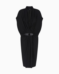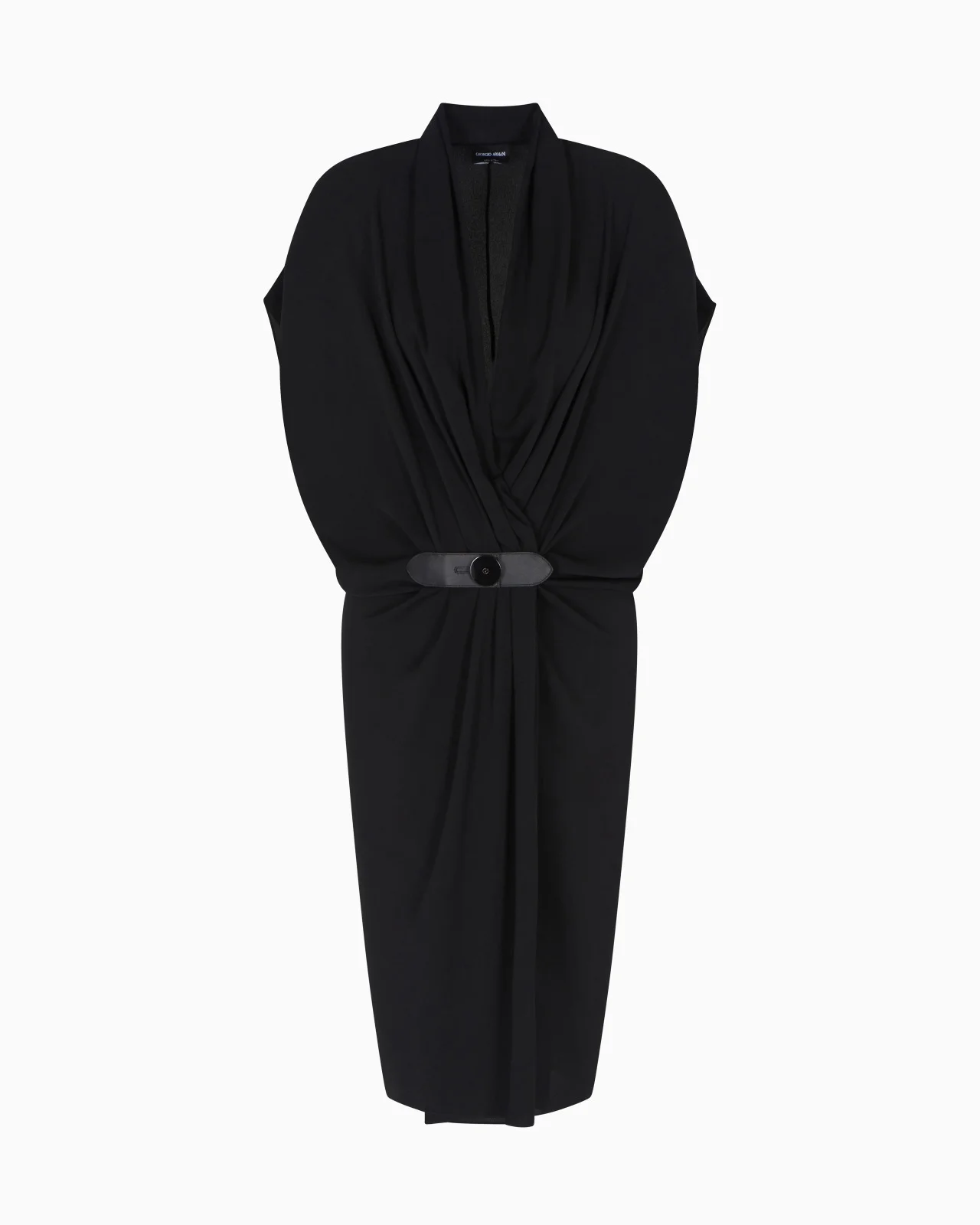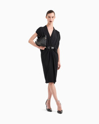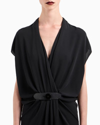 Sophisticated midi dress made from triple silk georgette, available in the collection’s deep black. The V-neck style has cap sleeves, and features a unique draped motif that adds movement to the piece, held in place by the small matching leather strap fastening. An elegant and refined offering, complementing sophisticated day-to-night looks.<br>The garment is part of the Holiday selection, which plays with a minimalist colour palette of black and white, colours that have always been a symbol of sophistication. A colour choice found in the fabrics, embroideries and accessories that express the essence of Armani spirit, distinguished by clean, androgynous-inspired lines, that are still always feminine and sensual. V neck Short cap sleeves Fully draped at the front Small leather strap waist closure with special logo button Unlined Length: 60 cm Made in Italy Product Code: GW001581TE10814UC001