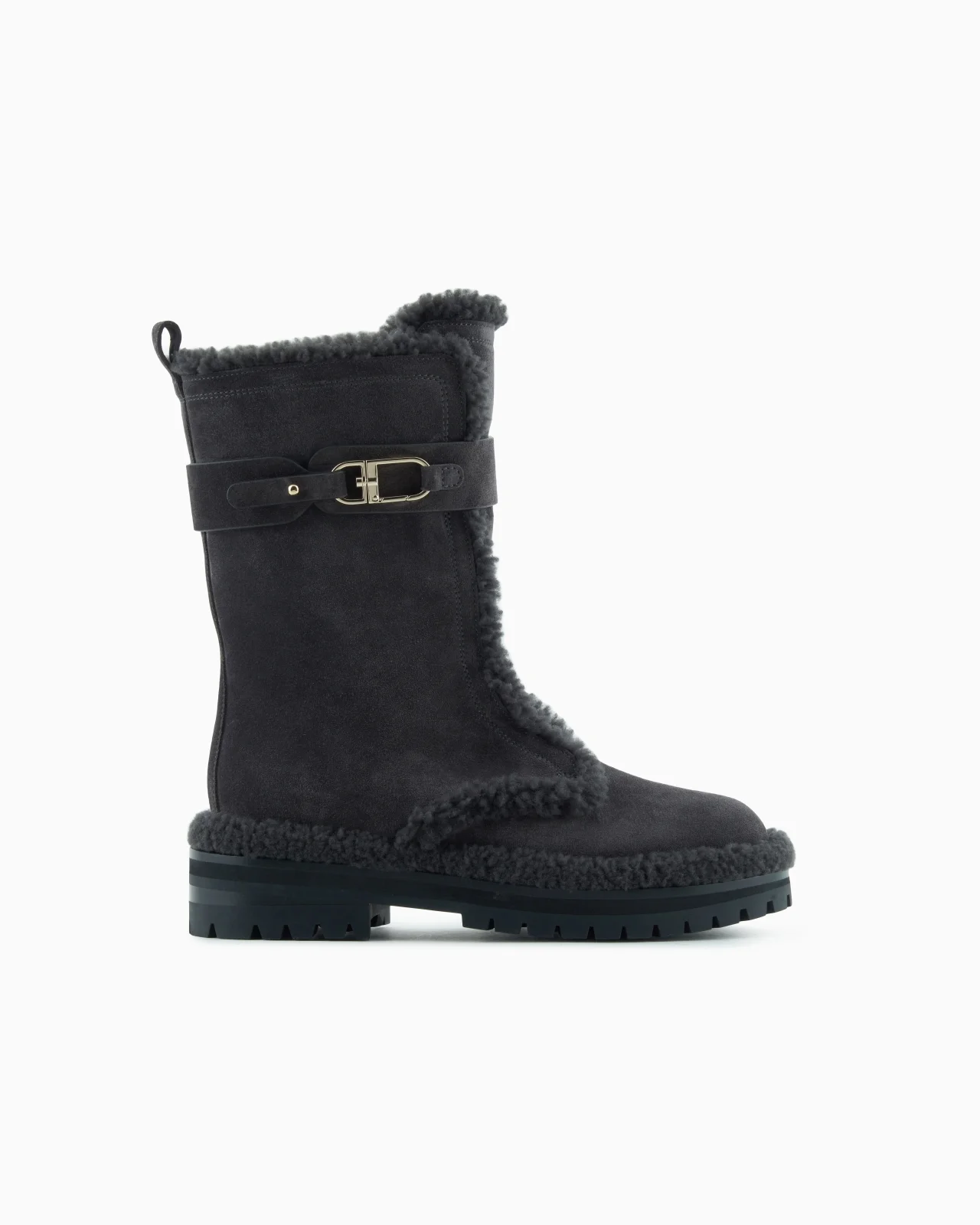Distinctive ankle boots in supple suede, embellished with a contrasting, warm shearling sheepskin trim and lining. Comfortable footwear with a rubber tread, illuminated by the metal detail of the snap hook that recalls the creations of the small leather goods collection, perfect for completing sophisticated, dedicated apres-ski looks. This footwear is part of the Giorgio Armani Neve collection, a selection dedicated to the world of winter sports and mountains. Featuring a colour palette inspired by nature and strongly connected to the ready-to-wear collection, the selection unfolds through relaxed, enveloping volumes, refined jacquard motifs and sophisticated, high-performance fabrics. Styles embellished with inserts and details in luxurious shearling lambskin, designed to bring elegance to every moment, from descents on the most famous slopes to apres-ski in the most exclusive locations. Suede upper Shearling sheepskin interior and trim Metal snap-hook detail Shearling sheepskin covered midsole Rubber lug tread Made in Italy Product Code: GW002306AF20482M8265