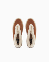Distinctive slip-ons in supple suede, embellished with contrasting, warm shearling sheepskin trim and lining. Comfortable footwear with a rubber tread, perfect for relaxing in winter locations. This footwear is part of the Giorgio Armani Neve collection, a selection dedicated to the world of winter sports and mountains. Featuring a colour palette inspired by nature and strongly connected to the ready-to-wear collection, the selection unfolds through relaxed, enveloping volumes, refined jacquard motifs and sophisticated, high-performance fabrics. Styles embellished with inserts and details in luxurious shearling lambskin, designed to bring elegance to every moment, from descents on the most famous slopes to apres-ski in the most exclusive locations. Suede upper Shearling sheepskin interior and trim Shearling sheepskin covered welt Rubber lug tread Made in Italy Product Code: GW002305AF20482M6218