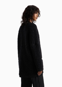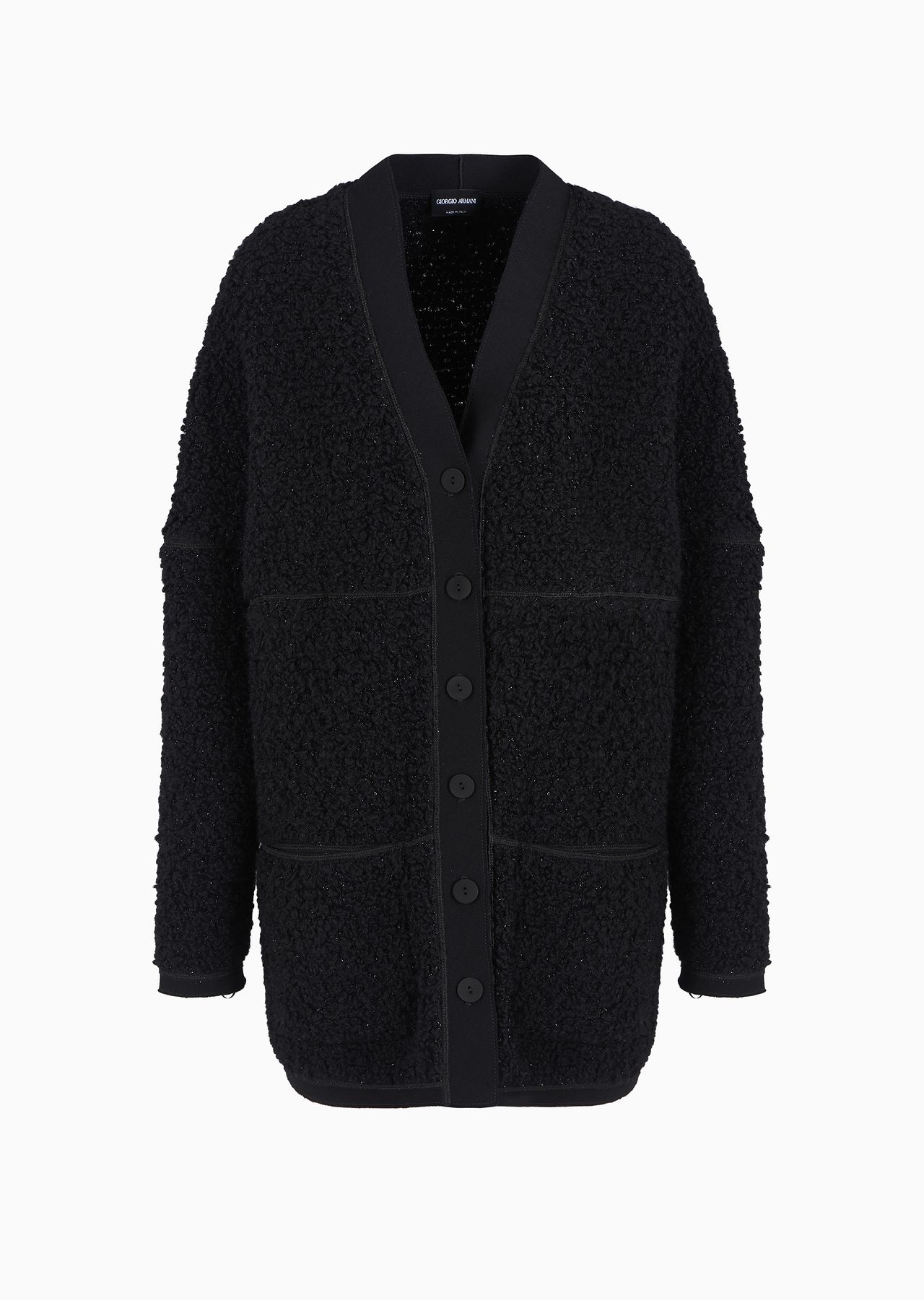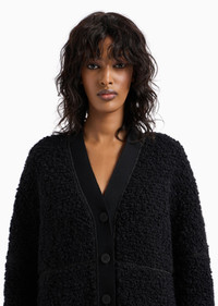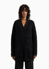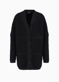 Loose cardigan made of boucle wool jersey, with wraparound volumes that feels extremely soft and warm. The style features a V neck, exposed button closure and matching stitching detail that creates a piping effect on the front and sleeves. A perfect piece to complete laid-back, casual outfits, designed for the day. Product Code: 6DAE60AJZWZ1UC99 Details Composition 84% Virgin Wool 16% Polyamide V neck Exposed button closure Monochromatic stitching detail with piping effect Two front inset pockets Length: 88 cm Made in Italy Fitting The model is 178 cm tall and is wearing size 38/S