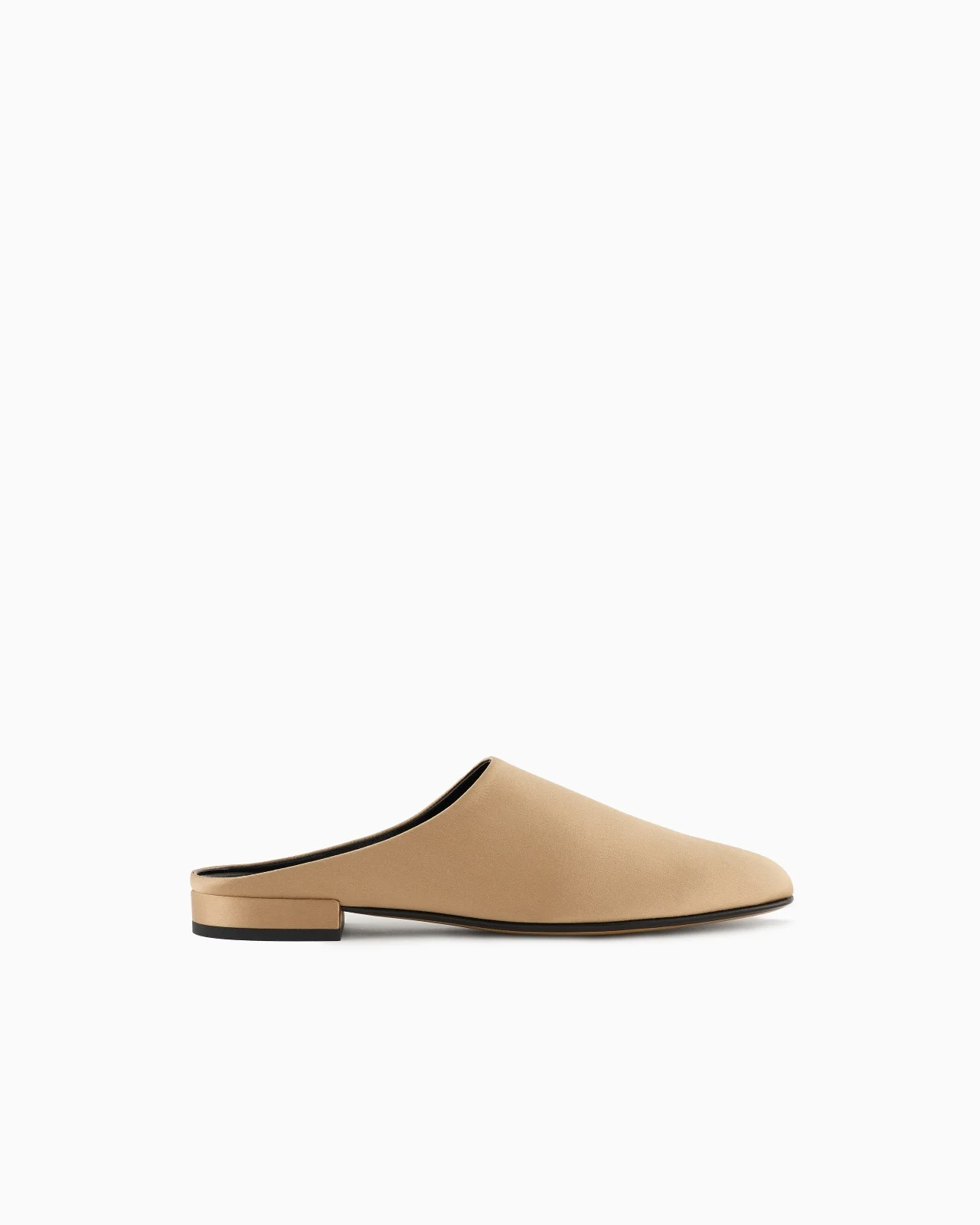 Mules made of satin with a minimalist aesthetic that sit along the silhouette of the foot. A style with a toe that follows the shape of the foot, reflecting the brand’s DNA and classic sense of elegance. The Giorgio Armani logo on the insole, inspired by the labels of the brand’s sophisticated clothing, customises this footwear. The offering is part of the Giorgio Armani x 10 Corso Como collection, a current, versatile selection of footwear featuring light and refined shapes in a classic style. Comfortable and minimalist flat styles, reflecting Armani’s iconic androgynous aesthetic, available in supple leather or fabrics with special variations, perfect for multiple occasions and designed for wearing day-to-night. Square toe Side detail for making them easy to put on and take off Leather insole with stitched logo label Nappa-leather lining Natural leather sole Overlapping cupped heel Heel height: 1 cm Custom box with dedicated dust bag Made in Italy Product Code: X1R038XD01000169