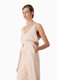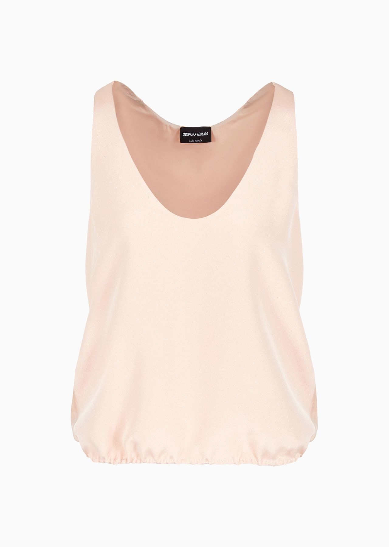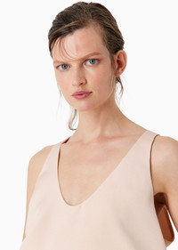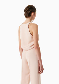 Elegant, sophisticated top made of marocain silk, featuring a subtle glitter effect. A sophisticated style with a fluid fit, the perfect piece for completing day and evening looks teamed with the collection’s trousers. Product Code: 4SHCC09BT04SJ1U4FS Details Composition 100% Silk Rounded collar Sleeveless Plunging back Gathering at the hem for a rounded effect Made in Italy Fitting The model is 178 cm tall and is wearing size 38/S