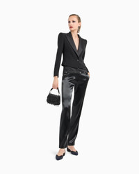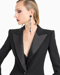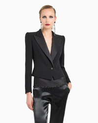 Short jacket made of glitter silk cady, a comfortable, smooth fabric, made special by a sparkling, subtle touch of glitter. The style is distinguished by its wide peak lapels and jewel button fastening. Its slim-fit, figure-hugging lines, which enhance and lengthen the feminine silhouette, make it perfect to pair with straight trousers and shimmering tops for looking elegant at exclusive events and parties. <br>The piece is part of the exclusive collection that celebrates the connection between Giorgio Armani and the world of Hollywood. A colour palette of deep blues combines with a profound and ever-elegant black, to create a sparkling, luxurious selection inspired by the limelight and most exclusive Hollywood parties. Extremely sophisticated pieces with iconic lines are made of velvets, silks and satins enlivened by crystal and rhinestone embellishments and refined workmanship. Looks for him and her, designed for evenings and special occasions. Single-breasted short jacket Peak lapels Single-breasted closure with one special button Hanging sleeves Lined Length: 48 cm from the centre back Made in Italy Product Code: GW001440TE14756UC003