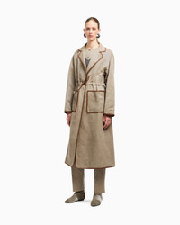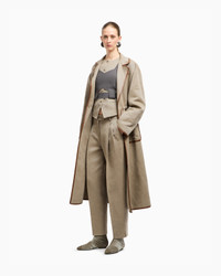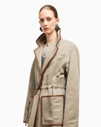 Trench coat made of hemp, viscose, cotton and modal cavalry, a fabric with a distinctive, refined texture. The style is distinguished by its essential construction, with a collar with notched lapels, a drawstring closure and large patch pockets. An offering made special by contrasting leather details, which are reminiscent of other collection creations, perfect to pair with the matching trousers for a sophisticated total look. The piece is part of the New Normal selection, an offering that reinterprets the brand’s archive looks with a modern twist. Pieces in elongated and fluid shapes and with an androgynous flavour dress the feminine silhouette with elegance for day-to-night looks. This season it comes in a natural colour palette animated by a series of chevron motif and houndstooth shapes, a clear reinterpretation of pieces "stolen" from the male wardrobe with a feminine twist. Notched lapels Drawstring-waist closure Two patch pockets Contrasting leather piping Partially lined Length: 125 cm from centre back Made in Italy Product Code: GW001797TE18004M6147