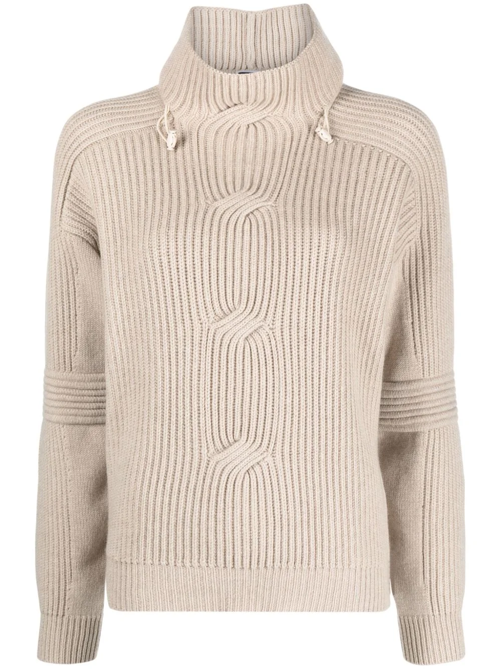 high-neck cashmere jumper Highlights - Beige - Cashmere - Chunky ribbed knit - Drawstring neck - High neck - Long sleeves - Ribbed cuffs and hem - Straight hem Made in Italy Composition Cashmere 100% SIZE & FIT Model measurements Height 5 ft 10 in(1.78 m) Bust/Chest 33.07 in(84 cm) Hips 36.61 in(93 cm) Waist 24.8 in(63 cm) FittingInformation Designed for a relaxed fit, this piece allows for comfort and movement when worn Made with a midweight knit, this piece offers some stretch This piece fits true to size – take your usual size Washing instructions Hand Wash
